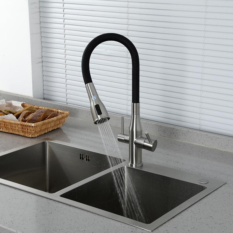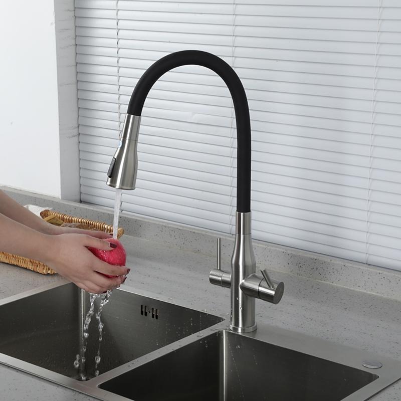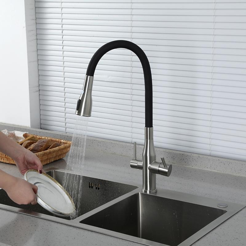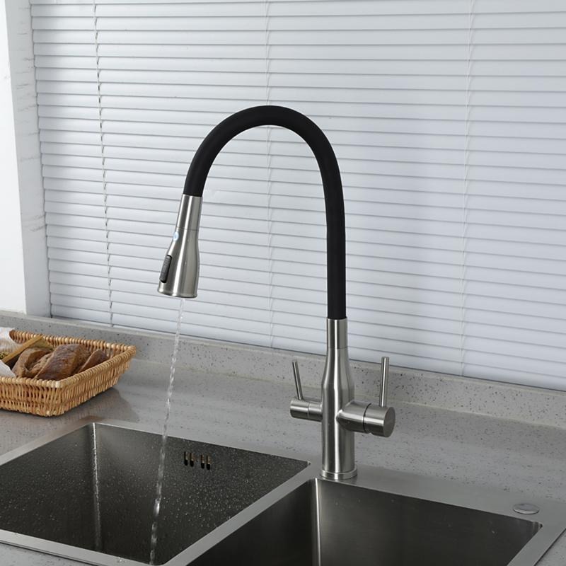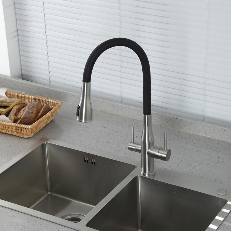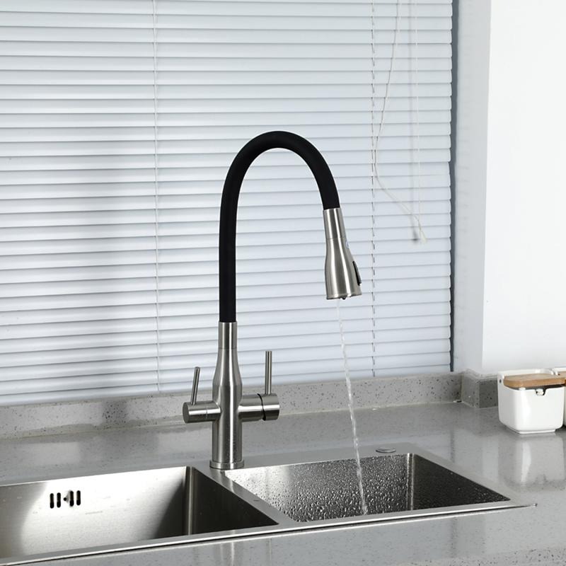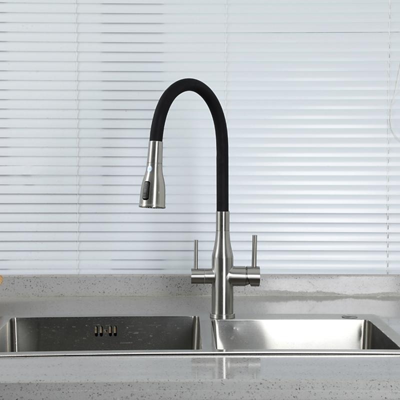 Смеситель для кухни Gappo G4399-65 с гибким изливом и подключением фильтра, материал - латунь, цвет - сатин/черный.