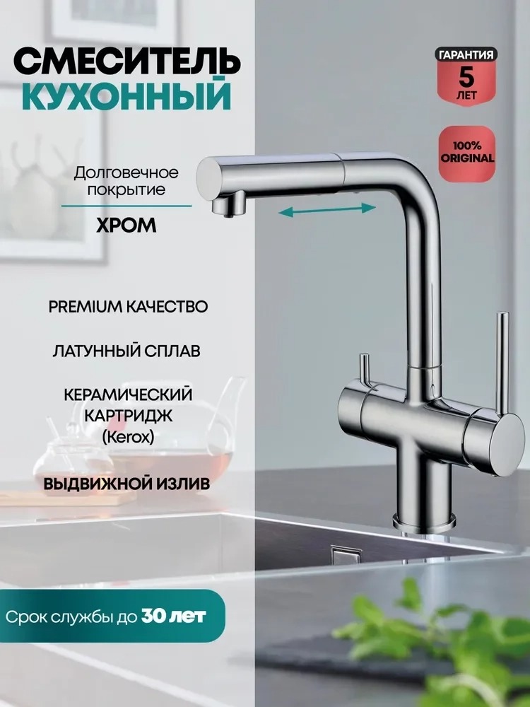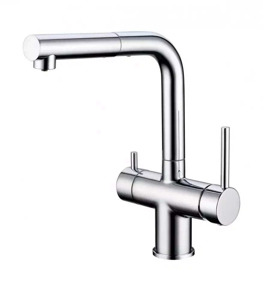 Смеситель для кухни Grocenberg GB4097CR с выдвижным изливом и подключением к фильтру питьевой воды, материал латунь, цвет - хром.