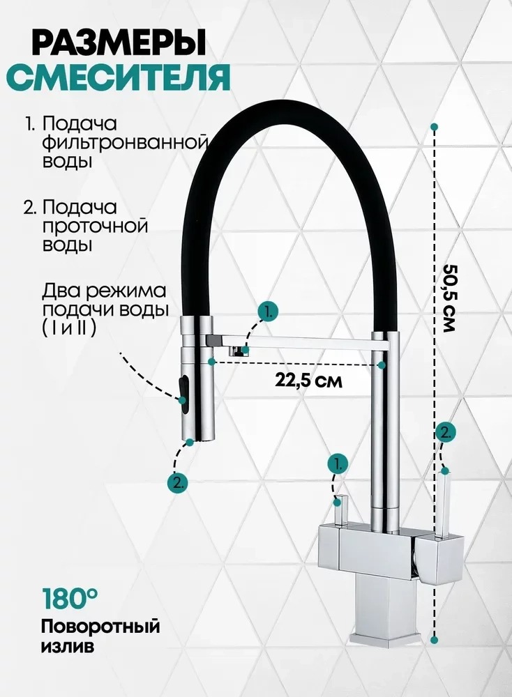 - Смеситель с подключением к фильтру и двумя режимами лейки.