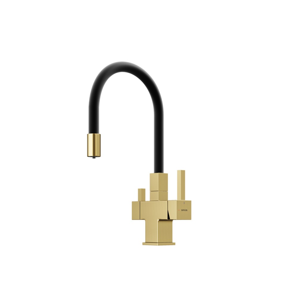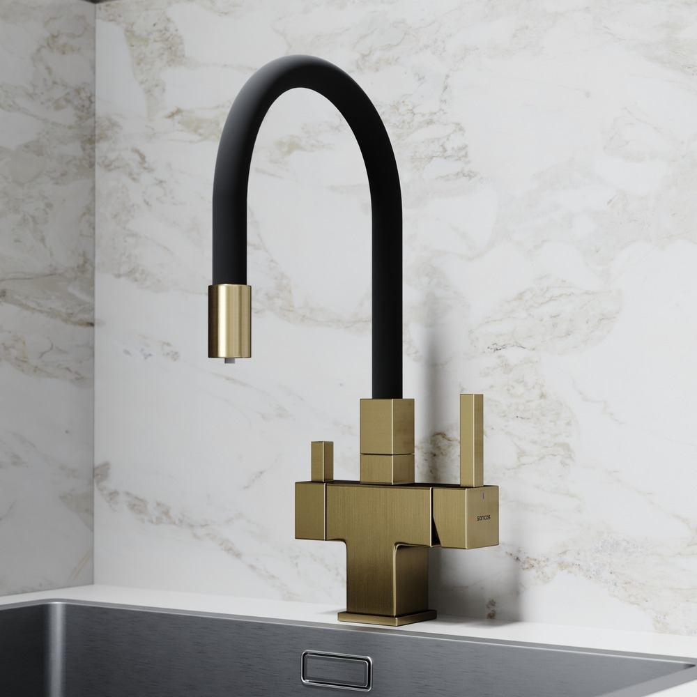 Смеситель для кухни Sancos Arno SC4005BG с гибким, поворотным изливом и подключением фильтра питьевой воды , материал - латунь, цвет - брашированное золото/чёрный.