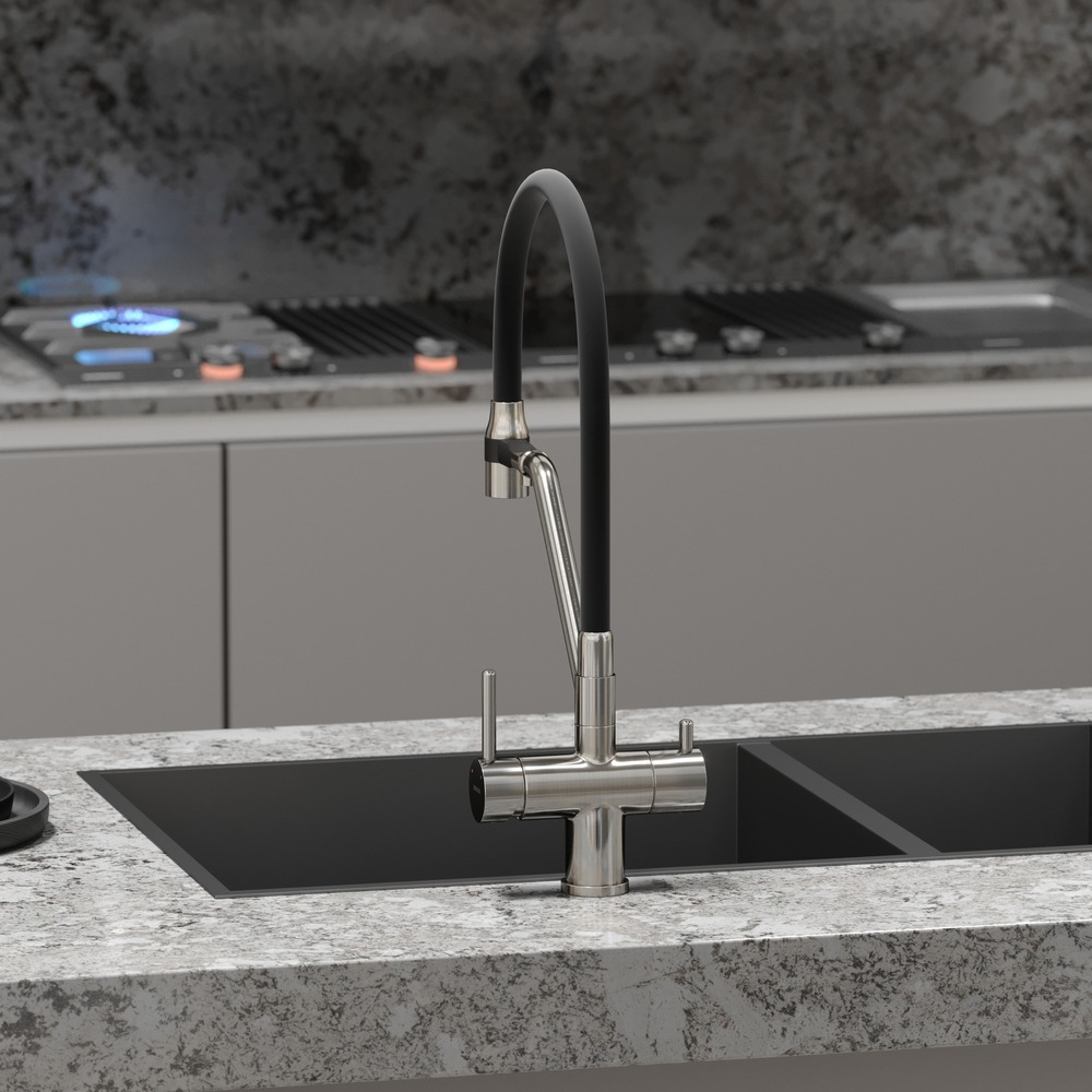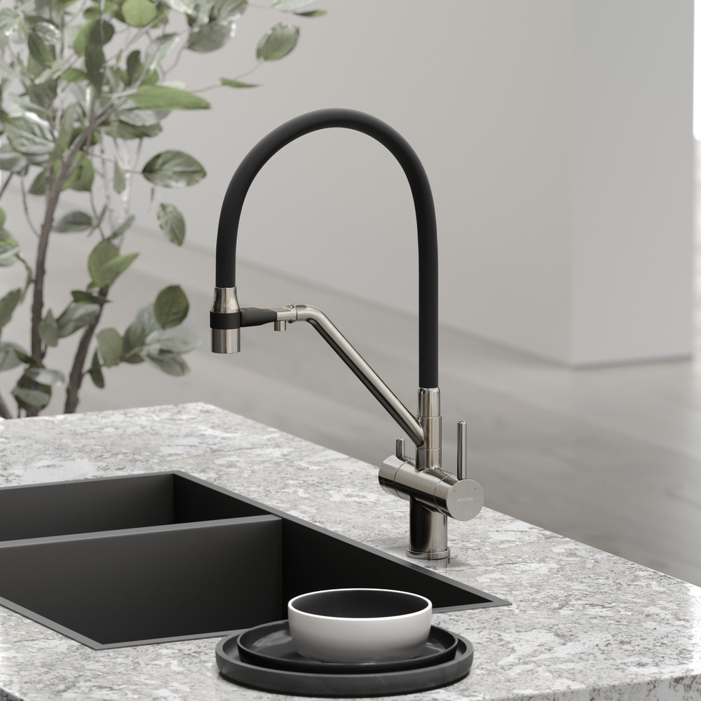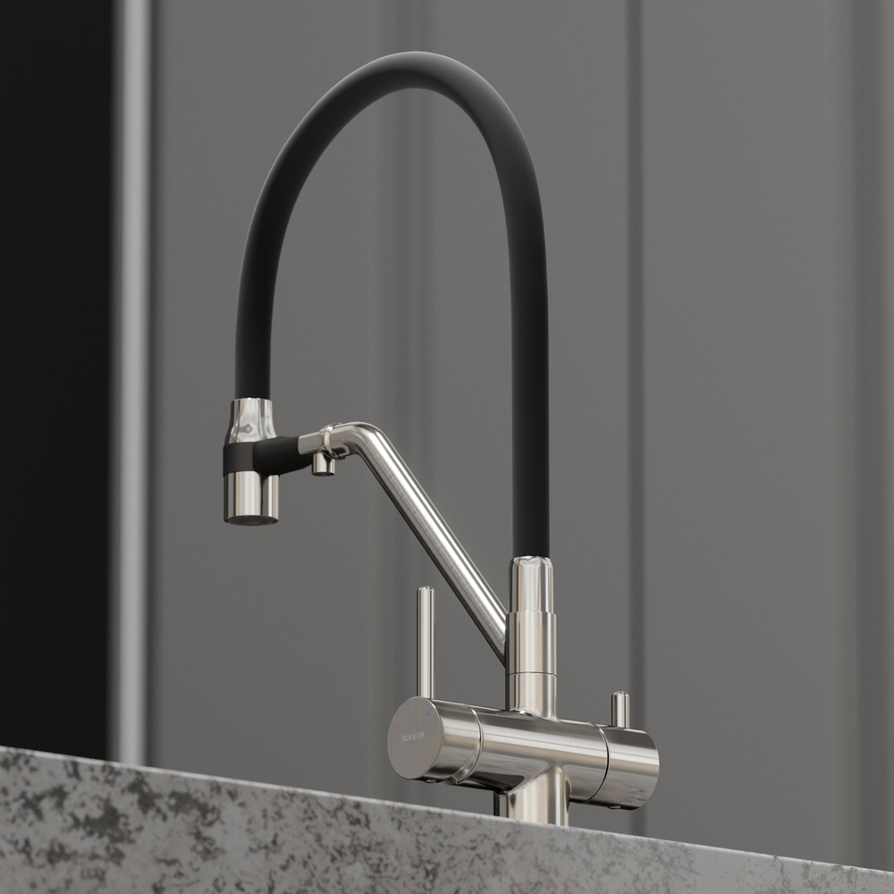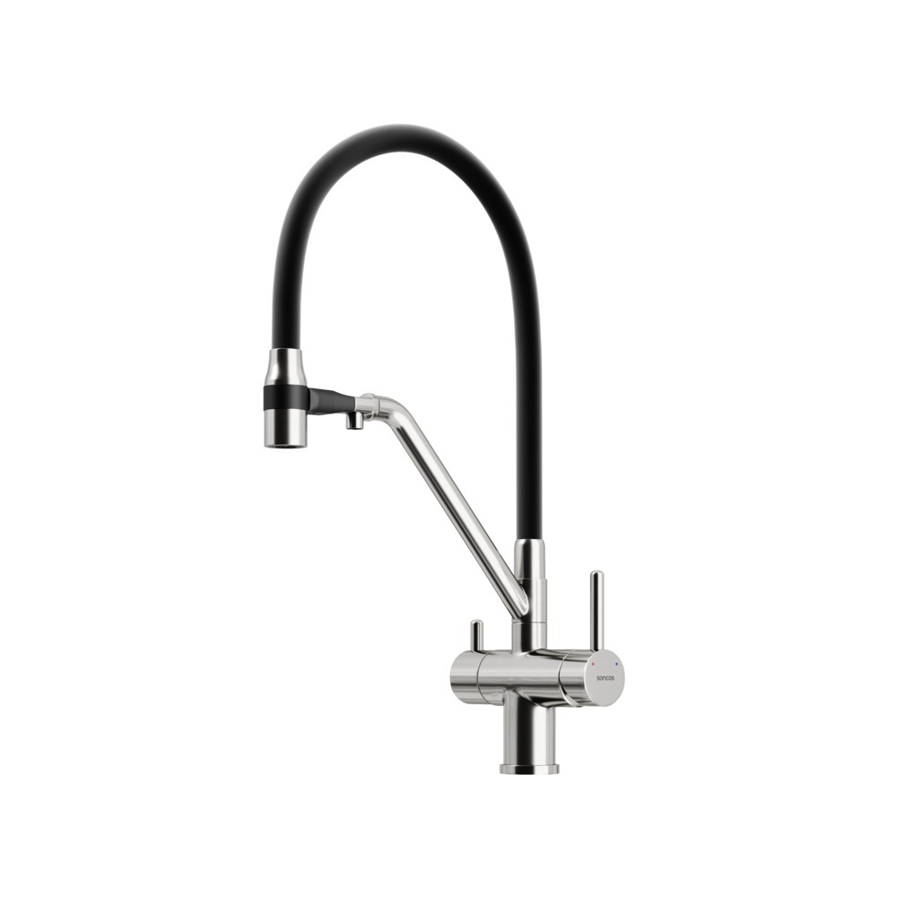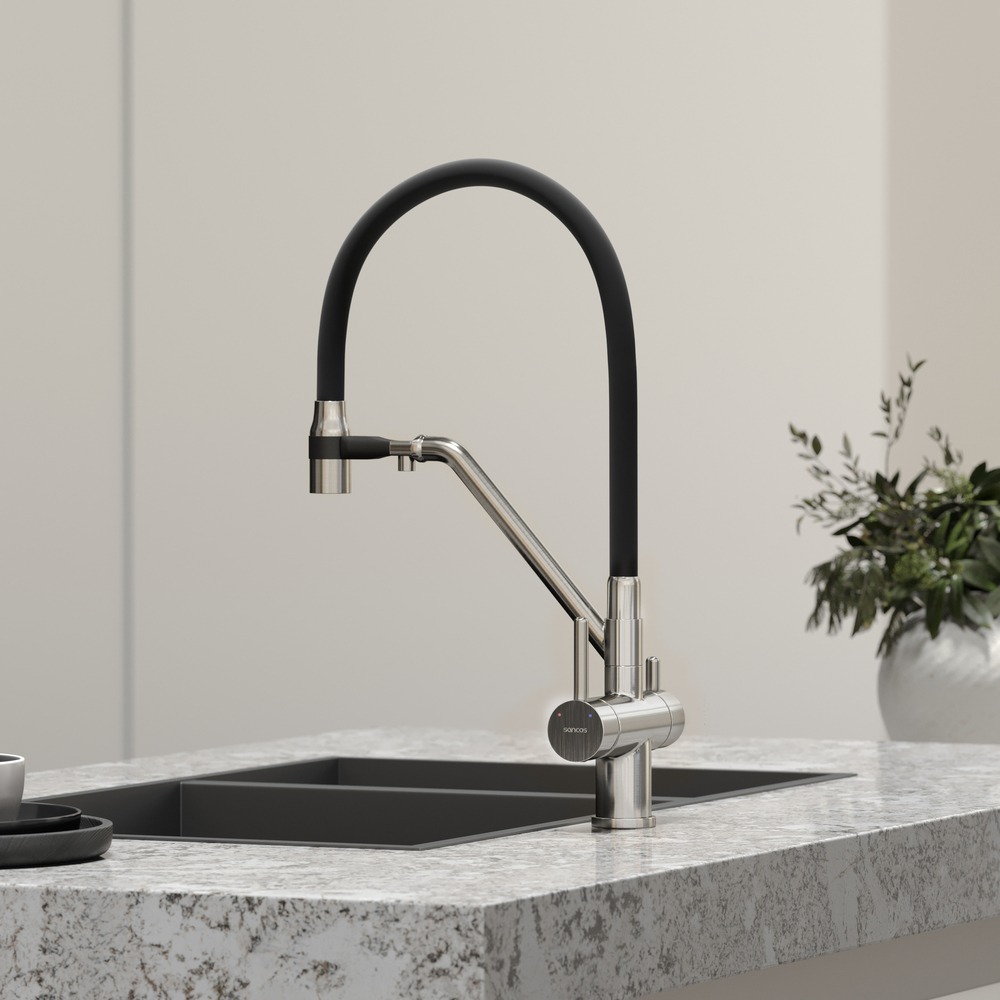 Смеситель для кухни Sancos Dora SC4003BN с гибким, поворотным изливом и подключением фильтра питьевой воды , материал - латунь, цвет - никель/чёрный.
