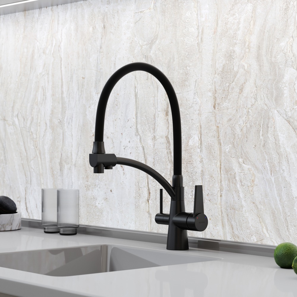 Смеситель для кухни Sancos Eri SC4001MB с гибким, поворотным изливом и подключением фильтра питьевой воды , материал - латунь, цвет - чёрный матовый/чёрный.
