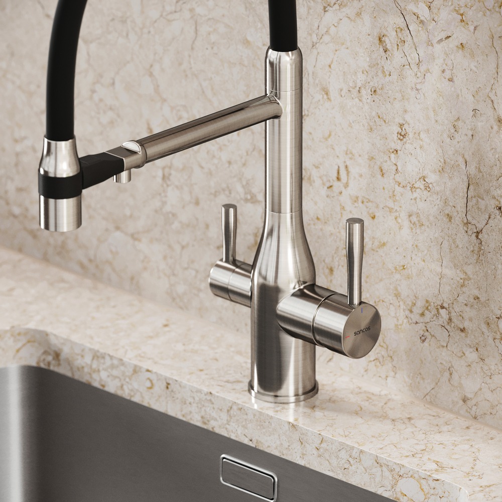 Смеситель для кухни Sancos Garda SC4009BN с гибким, поворотным изливом и подключением фильтра питьевой воды, материал - латунь, цвет - брашированный никель/чёрный.