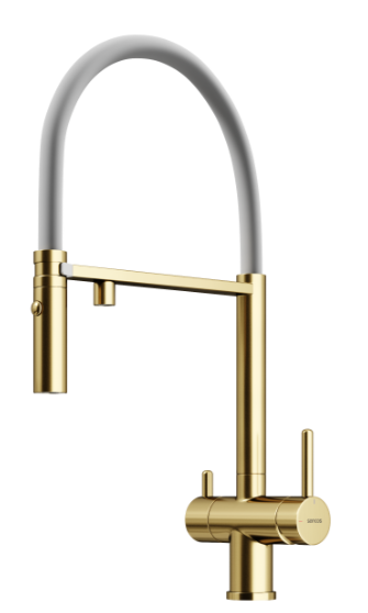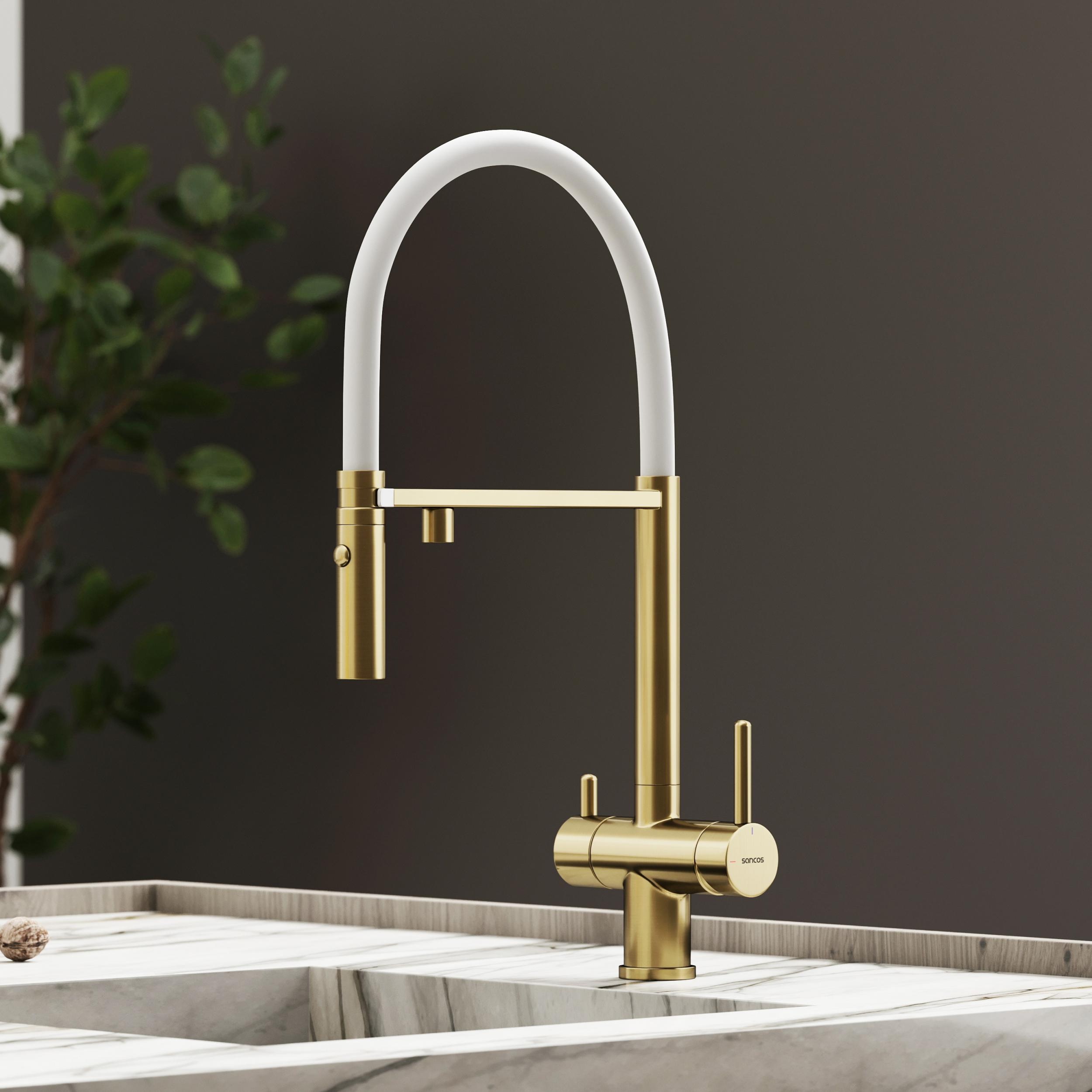 Смеситель для кухни Sancos Imola SC4010BG с гибким, поворотным изливом и подключением фильтра питьевой воды, материал - латунь, цвет - брашированное золото/белый.