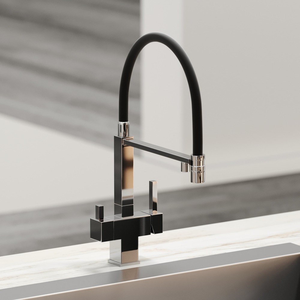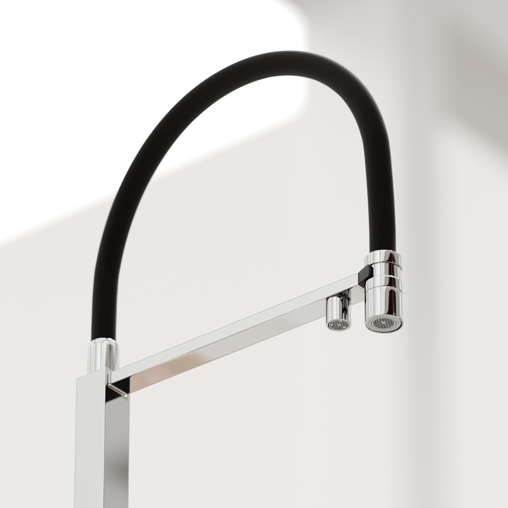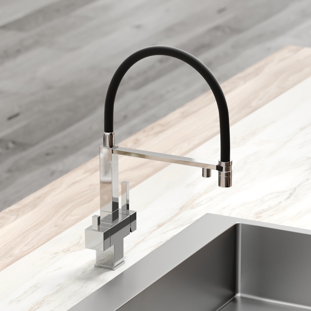 Смеситель для кухни Sancos Moro SC4006CH с гибким, поворотным изливом и подключением фильтра питьевой воды, материал - латунь, цвет - хром/чёрный.