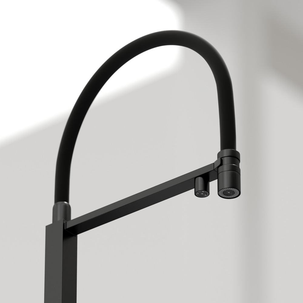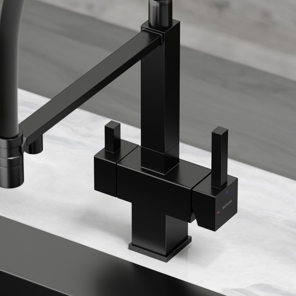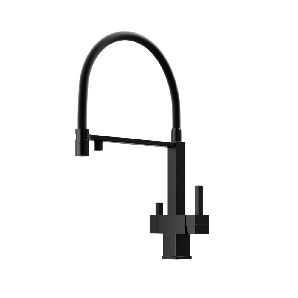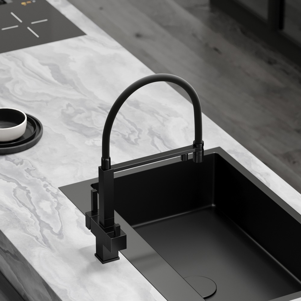 Смеситель для кухни Sancos Moro SC4006MB с гибким, поворотным изливом и подключением фильтра питьевой воды, материал - латунь, цвет - чёрный матовый/чёрный.