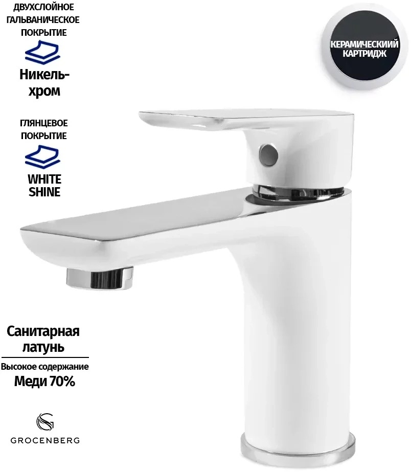 Смеситель для раковины Grocenberg GB2009WC, материал - латунь, цвет - белый хром.