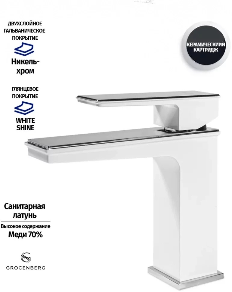 Смеситель для раковины Grocenberg GB2088WC, материал - латунь, цвет - белый хром.