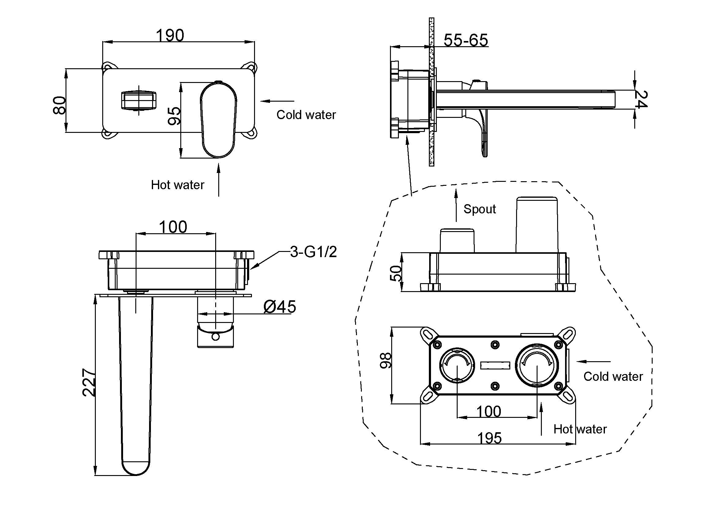 Смеситель для раковины настенный Boheme Spectre 455-MG со скрытой частью в комплекте, материал латунь, цвет золото матовое.