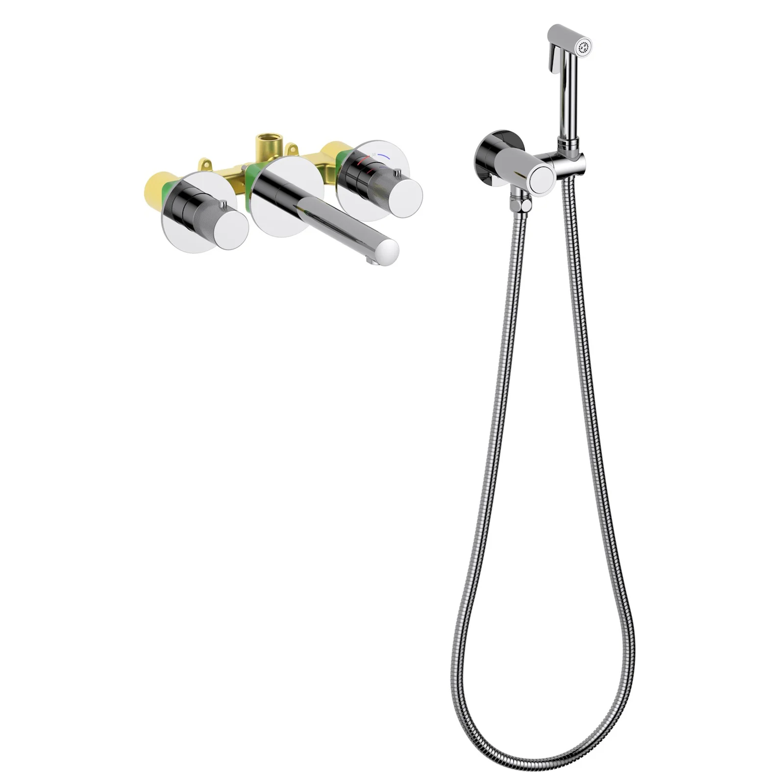 Смеситель для раковины настенный с термостатом и с гигиеническим душем Timo Saona 2383/00SM (со скрытой частью)