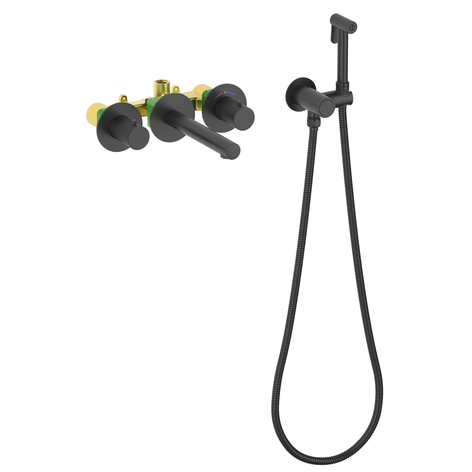 Смеситель для раковины настенный с термостатом и с гигиеническим душем Timo Saona 2383/03SM (со скрытой частью) чёрный матовый