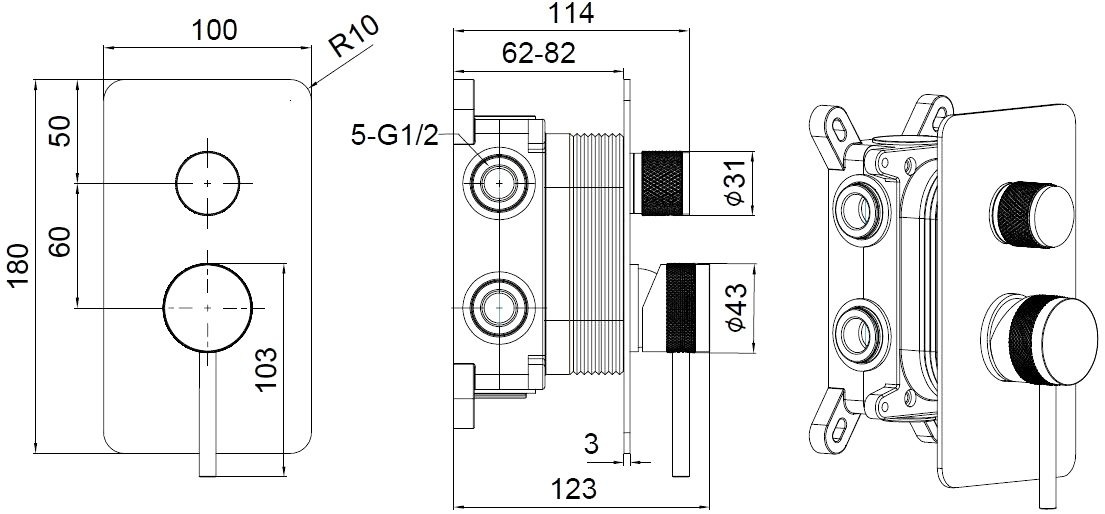 - для 3х потребителей воды, дополнительно приобретается оборудование на 3и потребителя (Пример: №1 верх.душ + №2 душевой набор с водорозеткой + №3 излив ИЛИ другие комбинации из 3х элементов)