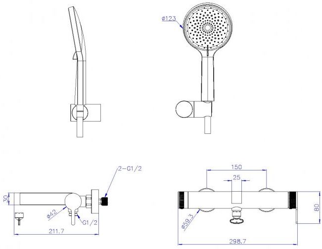 - Оснащение: эксцентрики, аэратор, 3-х режимная душевая лейка из ABS, душевой шланг 150 см PVC, держатель душевой лейки из ABS