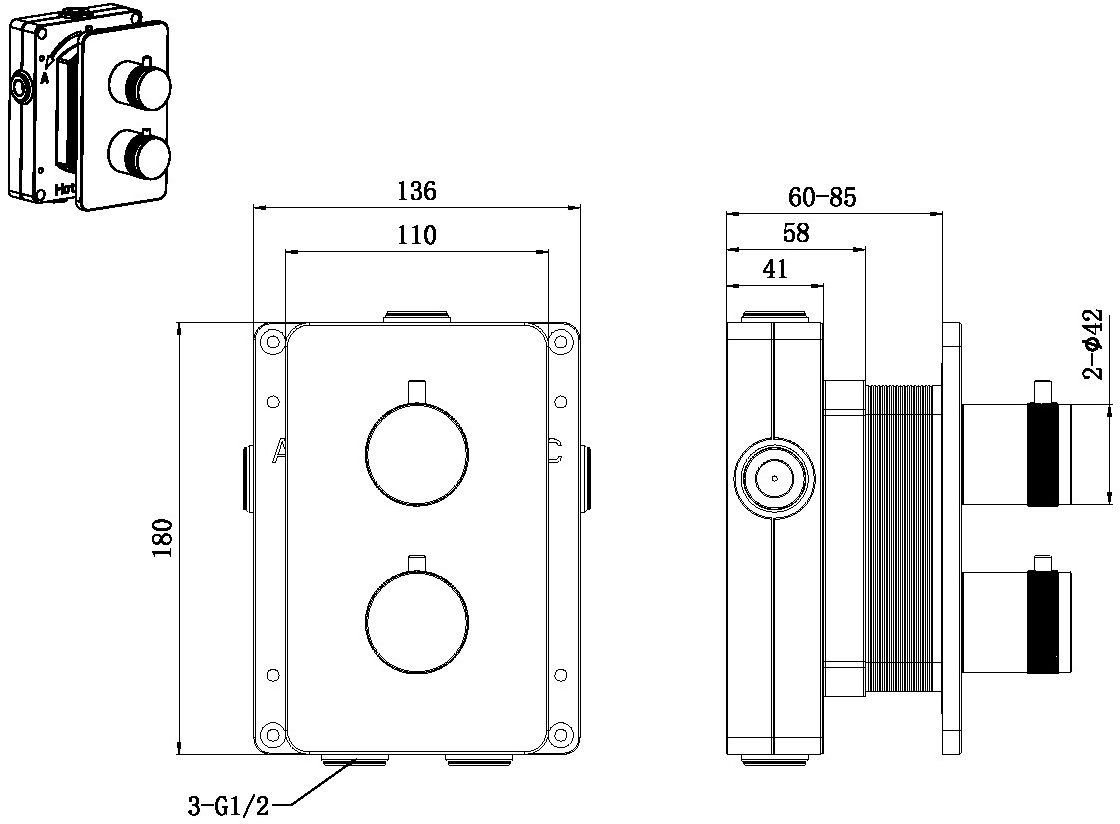 - Встраиваемый Термостатический смеситель на 2а потребителя воды, дополнительно приобретается оборудование на 2а потребителя (Пример: №1 верх.душ + №2 душевой набор с водорозеткой ИЛИ другие комбинации из 2х элементов)