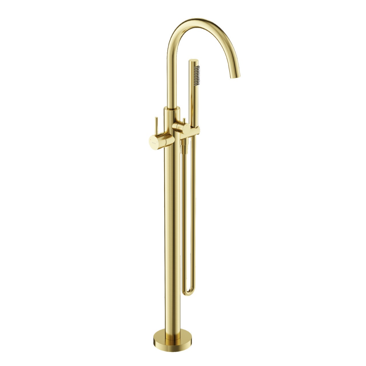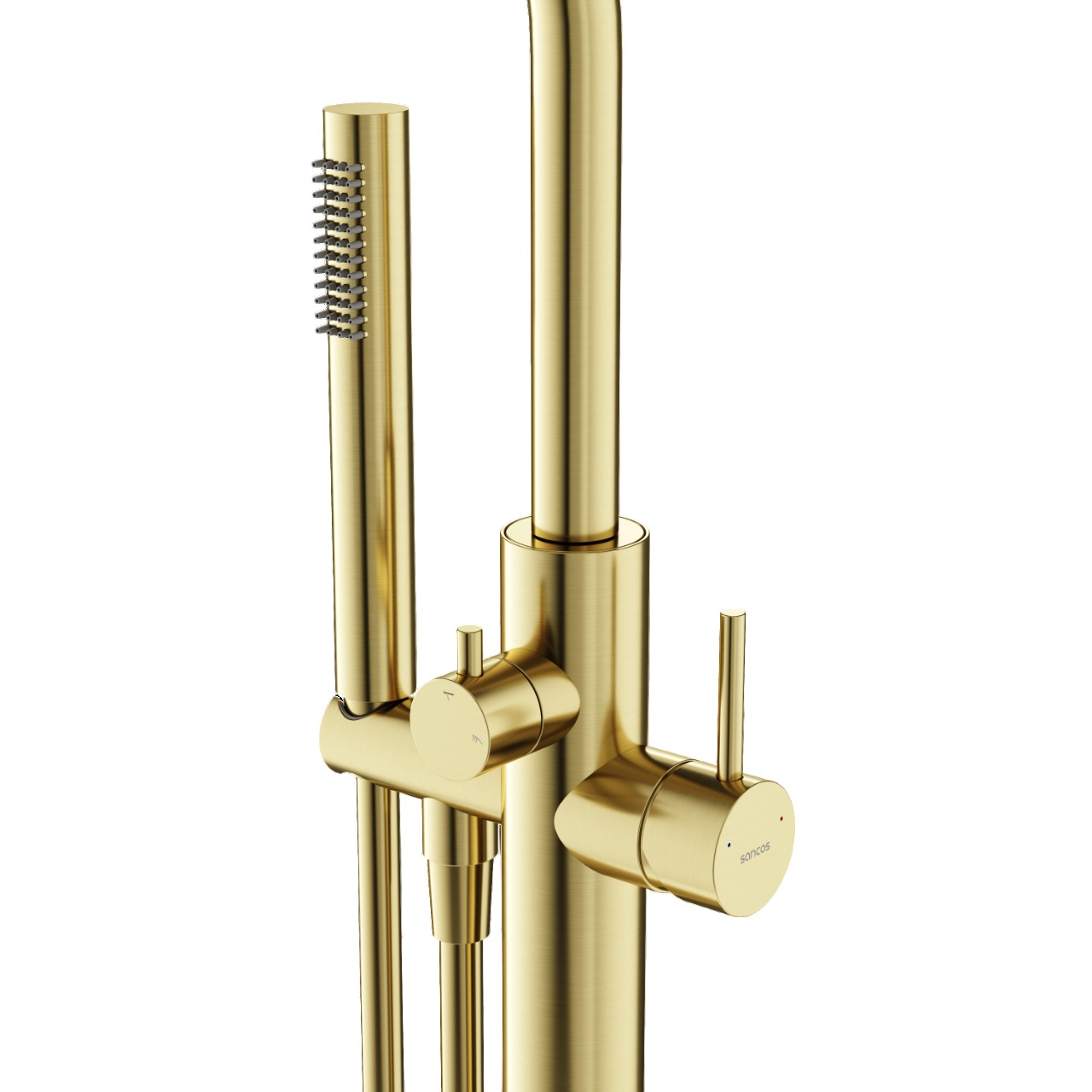 Смеситель для ванны Sancos Etna SC9009BG с душевым гарнитуром, количество режимов душевой лейки - 1, длина душевого шланга - 125 см, поворотный излив, материал - латунь, цвет - брашированное золото.