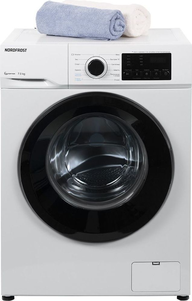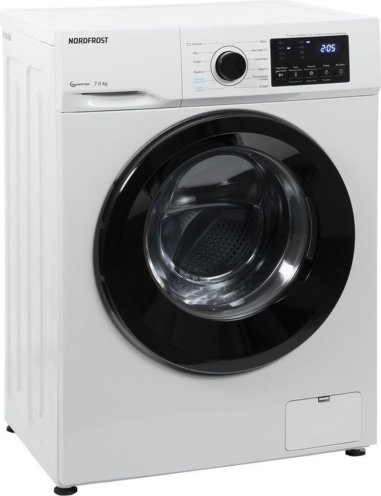 - Отдельностоящая стиральная машина NORDFROST i-WSQ4 7140 W с функцией пара имеет прекрасный показатель загрузки белья до 7 кг и инверторный мотор. Он работает тише стандартного, отличается долговечностью и ресурсосбережением.