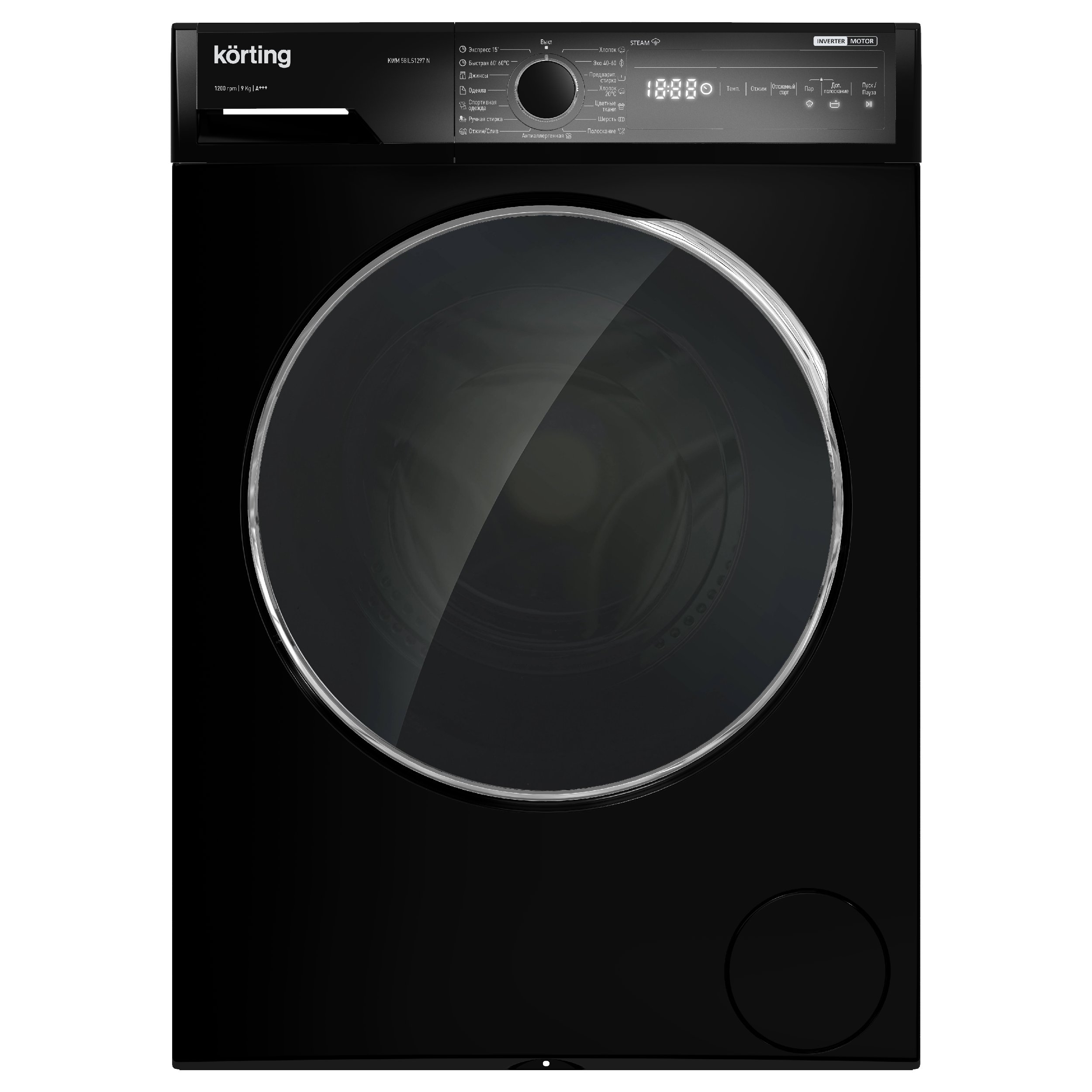 Стиральная машина с паром Korting KWM 58ILS1297 N с инверторным двигателем, цвет чёрный.