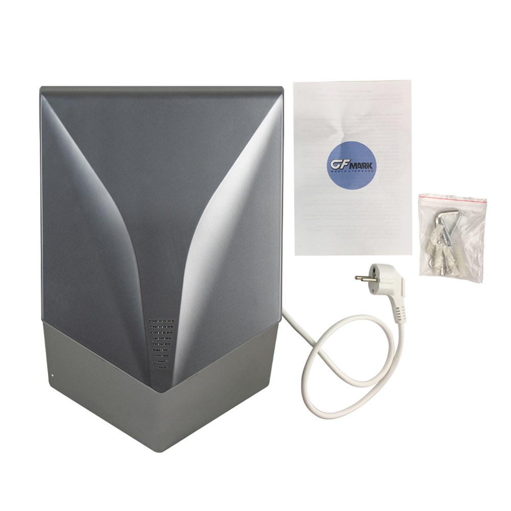 Электрическая сушилка для рук, скоростная, c направленным потоком воздуха из двух плоских сопел, расположенных под углом друг к другу, цвет серый, с неоновой подсветкой, незаменима в местах с большой проходимостью людей (бизнес-центры, торговые центры, гостиницы, кинотеатры, рестораны). Корпус сушилки изготовлен из прочного пластика АБС серого цвета, который выдерживает различные механические воздействия. Прибор отличается средней мощностью и большой скоростью, что позволит использовать оборудование в различных помещениях с ограниченным электропотреблением или старой проводкой. Для удобства эксплуатации в сушилке для рук предусмотрен инфракрасный датчик движения, который включает прибор без прикосновения к нему, при поднесении рук. Сушилка оснащена надёжным и долговечным двигателем. Прибор облачён в ударопрочный корпус. Параметры - 1000W, автоматическая, АС 220-230В 50/60Гц, сенсор включения 50 - 150 мм, скорость потока >95 м/c, температура воздуха >40°C, влагозащищенность IPX4.