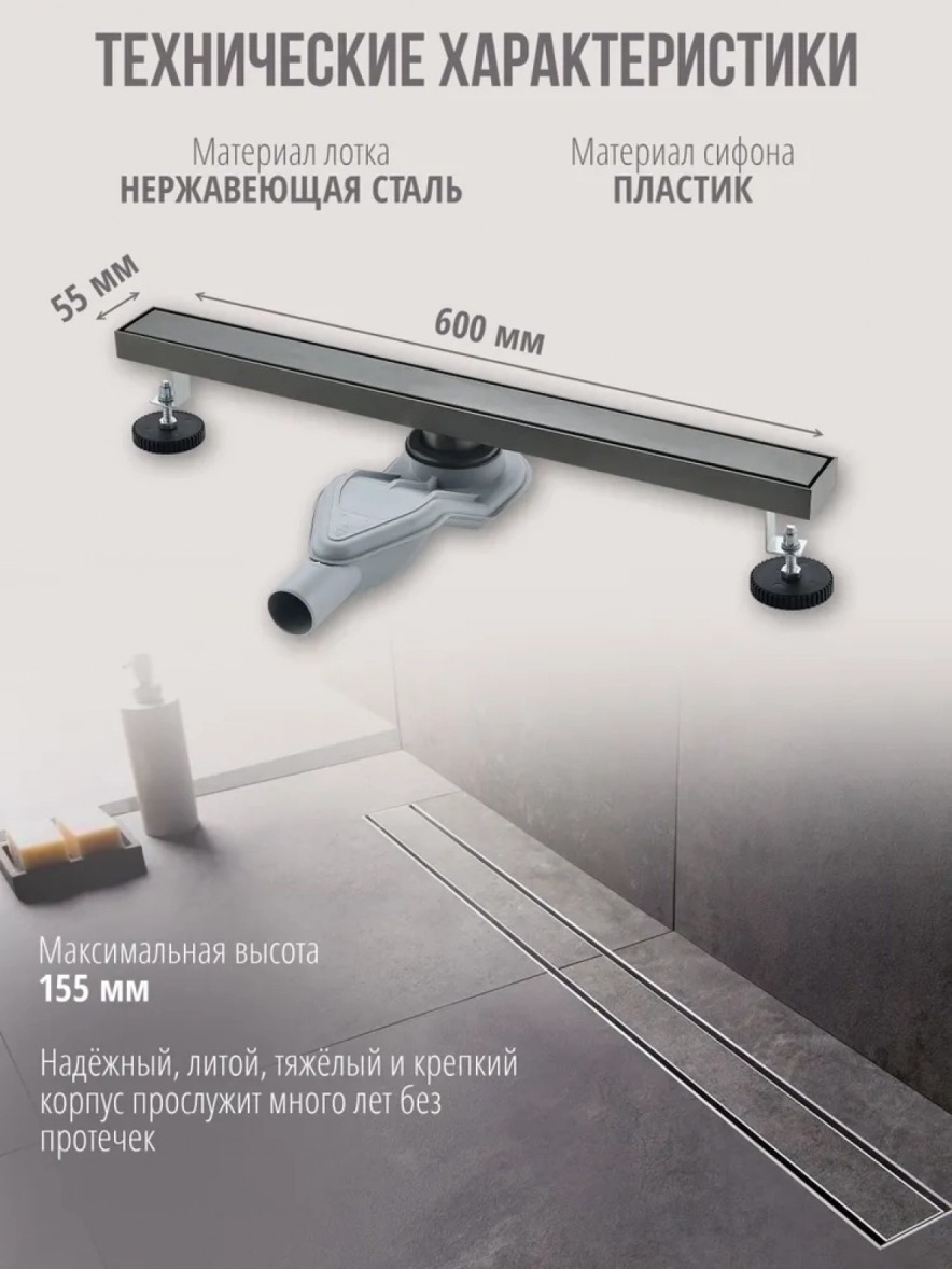 - В комплект входит трап, ножки, сифон, набор для монтажа.