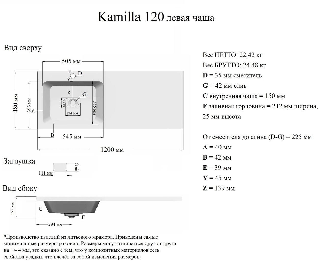 Тумба напольная Grossman Вилар 60 см с раковиной Камилла 120 см, левая, материал раковины искусственный мрамор, кронштейн в комплекте, цвет белый глянец.