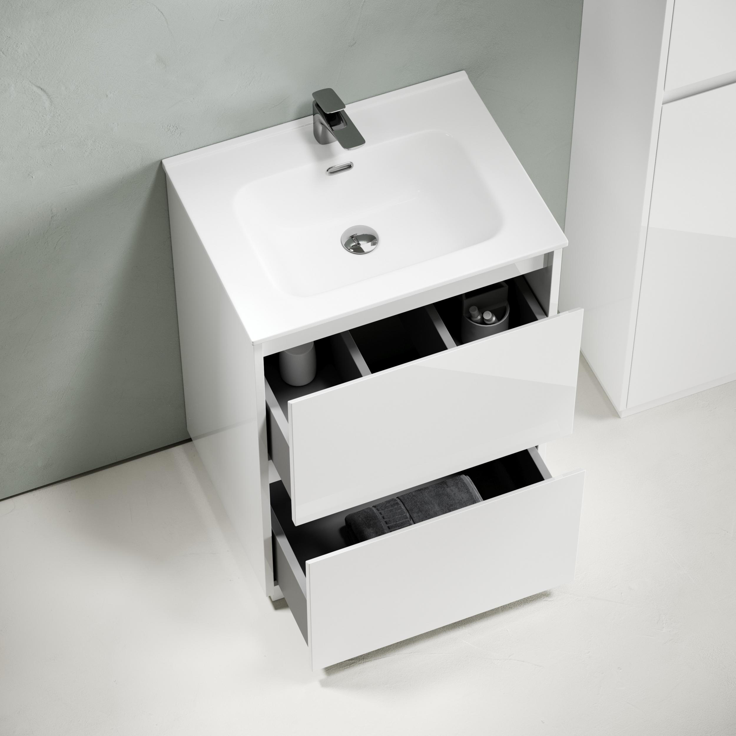 Тумба напольная с раковиной Sancos Libra Floor 60 см LB60FW с доводчиком и раковиной Element CN7001, цвет белый глянец.