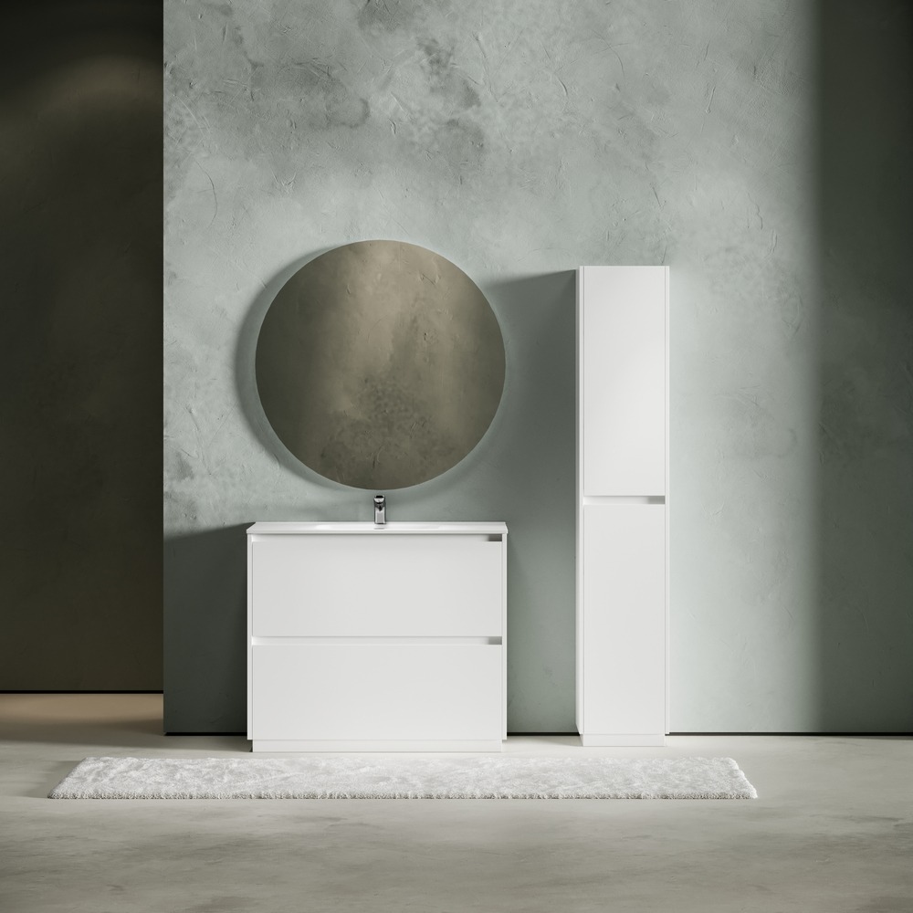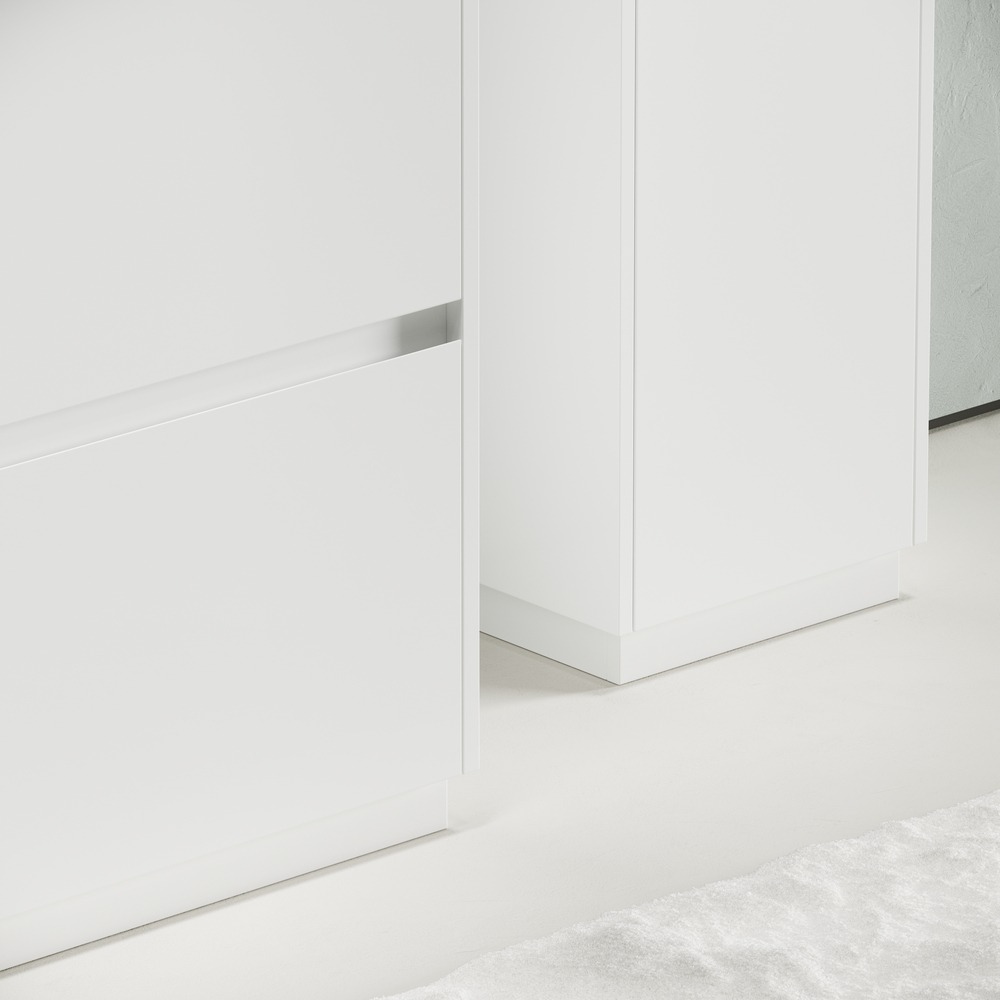 Тумба напольная Libra c двумя ящиками с доводчиками скрытого монтажа, с системой плавного закрывания и с ручкой по всей длине ящика. Каркас и фасад тумбы выполнен из ЛДСП, покрытие эмаль, цвет белый глянец. Основание тумбы имеет ножки c регулировкой высоты до 10 мм для компенсации возможной неровности напольного покрытия. Внутреннее пространство тумбы выполнено из надежного ЛДСП серого цвета.