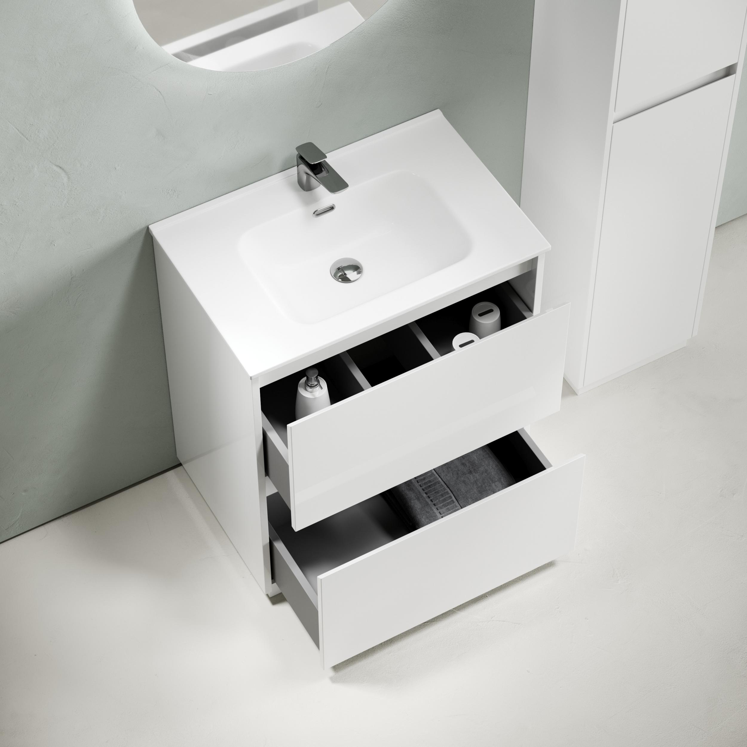Тумба напольная Libra c двумя ящиками с доводчиками скрытого монтажа, с системой плавного закрывания и с ручкой по всей длине ящика. Каркас и фасад тумбы выполнен из ЛДСП, покрытие эмаль, цвет белый глянец. Основание тумбы имеет ножки c регулировкой высоты до 10 мм для компенсации возможной неровности напольного покрытия. Внутреннее пространство тумбы выполнено из надежного ЛДСП серого цвета.