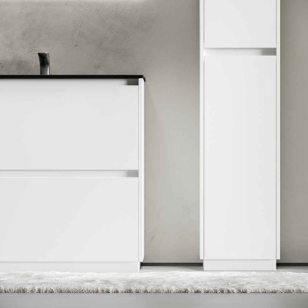 Тумба напольная Libra c двумя ящиками с доводчиками скрытого монтажа, с системой плавного закрывания и с ручкой по всей длине ящика. Каркас и фасад тумбы выполнен из ЛДСП, покрытие эмаль, цвет белый глянец. Основание тумбы имеет ножки c регулировкой высоты до 10 мм для компенсации возможной неровности напольного покрытия. Внутреннее пространство тумбы выполнено из надежного ЛДСП серого цвета.