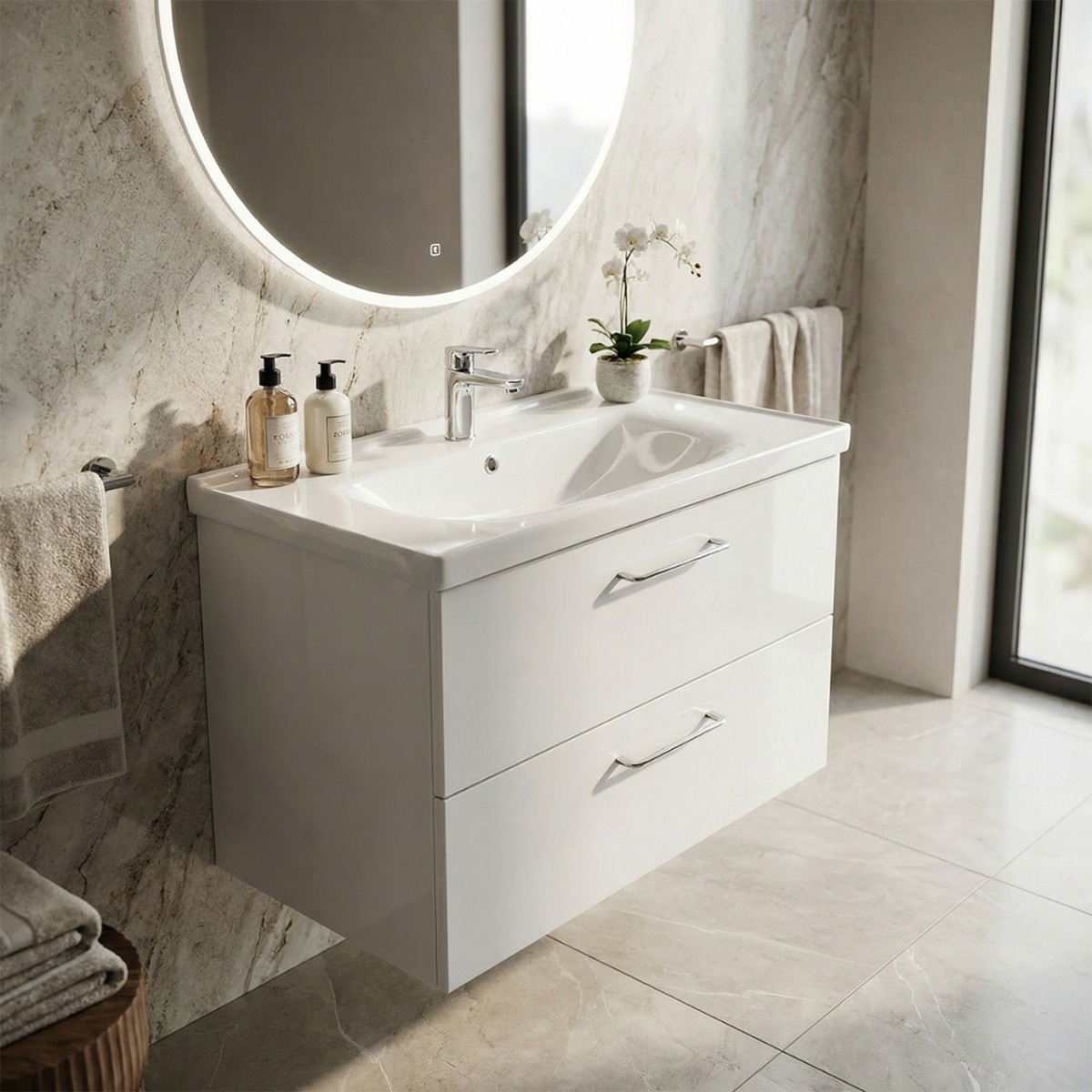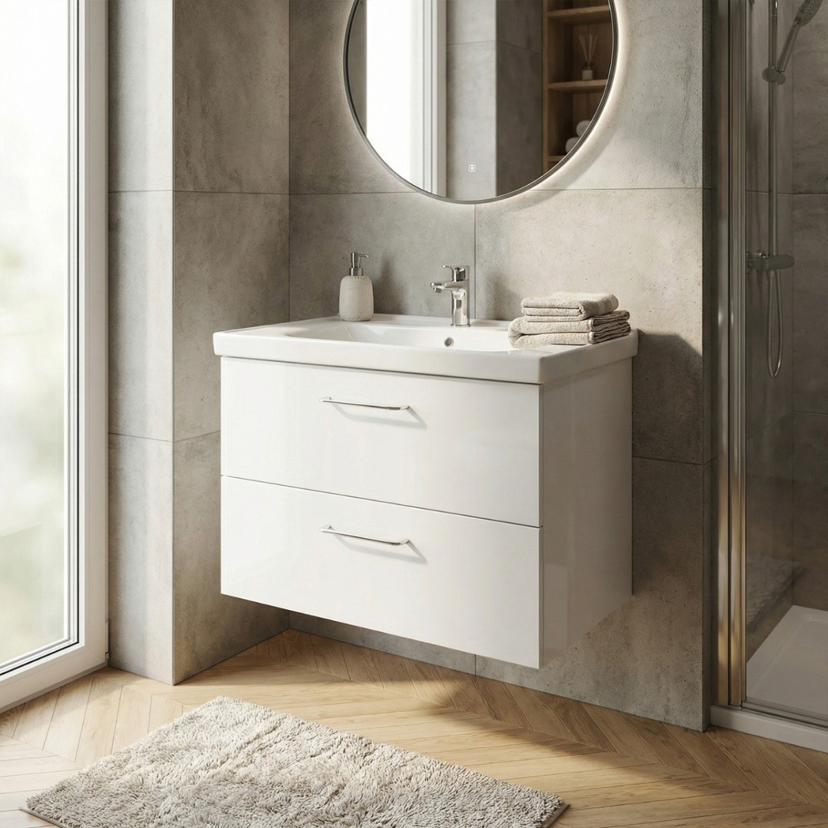 - Два выдвижных ящика: Просторные ящики с механизмом доводчика обеспечивают плавное и бесшумное закрывание, предотвращая удары и продлевая срок службы мебели. Это идеальное место для хранения полотенец, косметики, бытовой химии и других необходимых мелочей, поддерживая порядок в ванной комнате.