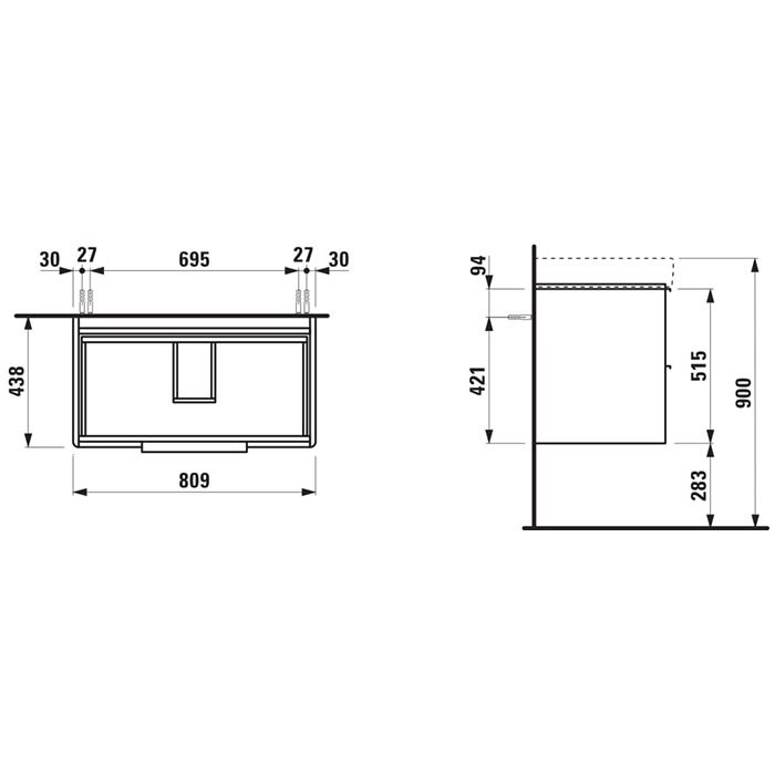 Тумба подвесная Laufen Base 4.0239.2.110.261.1 (810х515х438 мм) с 2 ящиками + раковина Laufen Pro S 8.1396.5.000.104.1 (850х95х465 мм), цвет белый.