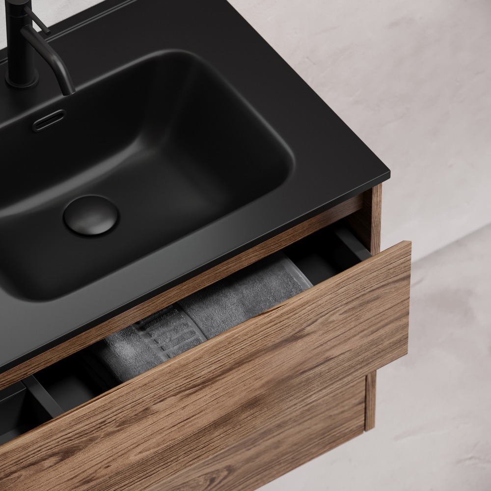 - Тумба подвесная Libra c двумя ящиками оснащенными доводчиками скрытого монтажа с системой плавного закрывания и с ручкой по всей длине ящика. Каркас и фасад тумбы выполнен из ЛДСП в цвете «дуб чарльстон». Покрытие - ламинат.