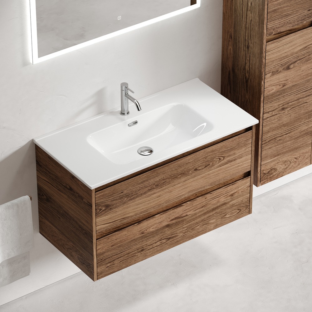 Тумба подвесная с раковиной Sancos Libra 90 см LB90ECH c доводчиком и раковиной Element CN7002, цвет дуб чарльстон.