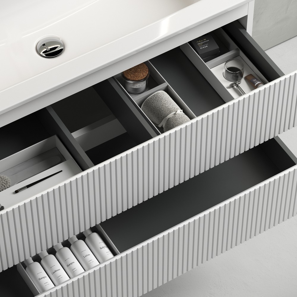 - Тумба подвесная Snob T c двумя ящиками оснащенными доводчиками скрытого монтажа с системой плавного закрывания. Каркас и фасад тумбы выполнен из МДФ, покрытие пвх - плёнка в цвете «Bianco». Размер 1195х445х500