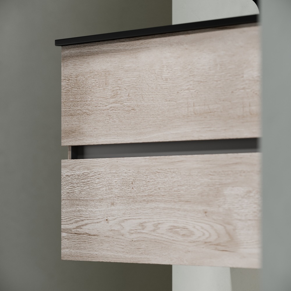 - Тумба подвесная Urban c двумя ящиками оснащенными доводчиками скрытого монтажа с системой плавного закрывания, а также с ручкой Gola по всей длине тумбы. Каркас тумбы и фасад выполнен из ЛДСП в цвете «дуб галифакс натуральный».