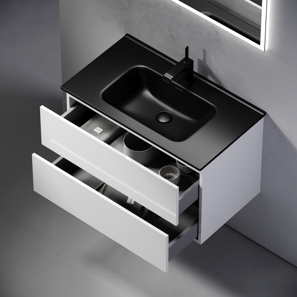 - Тумба подвесная Urban c двумя ящиками оснащенными доводчиками скрытого монтажа с системой плавного закрывания, а также с ручкой Gola по всей длине тумбы. Корпус тумбы выполнен из ЛДСП, фасад – из МДФ с покрытием "эмаль" в цвете «белый глянец».