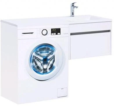 - Раковина из литьевого мрамора имеет длинную платформу, которая выходит далеко за пределы тумбы. Она предназначена для того, чтобы установить с правой стороны от тумбы стиральную машину. Платформа имеет такую длину, которая позволит спрятать под нее машинку средних размеров с фронтальной загрузкой.
