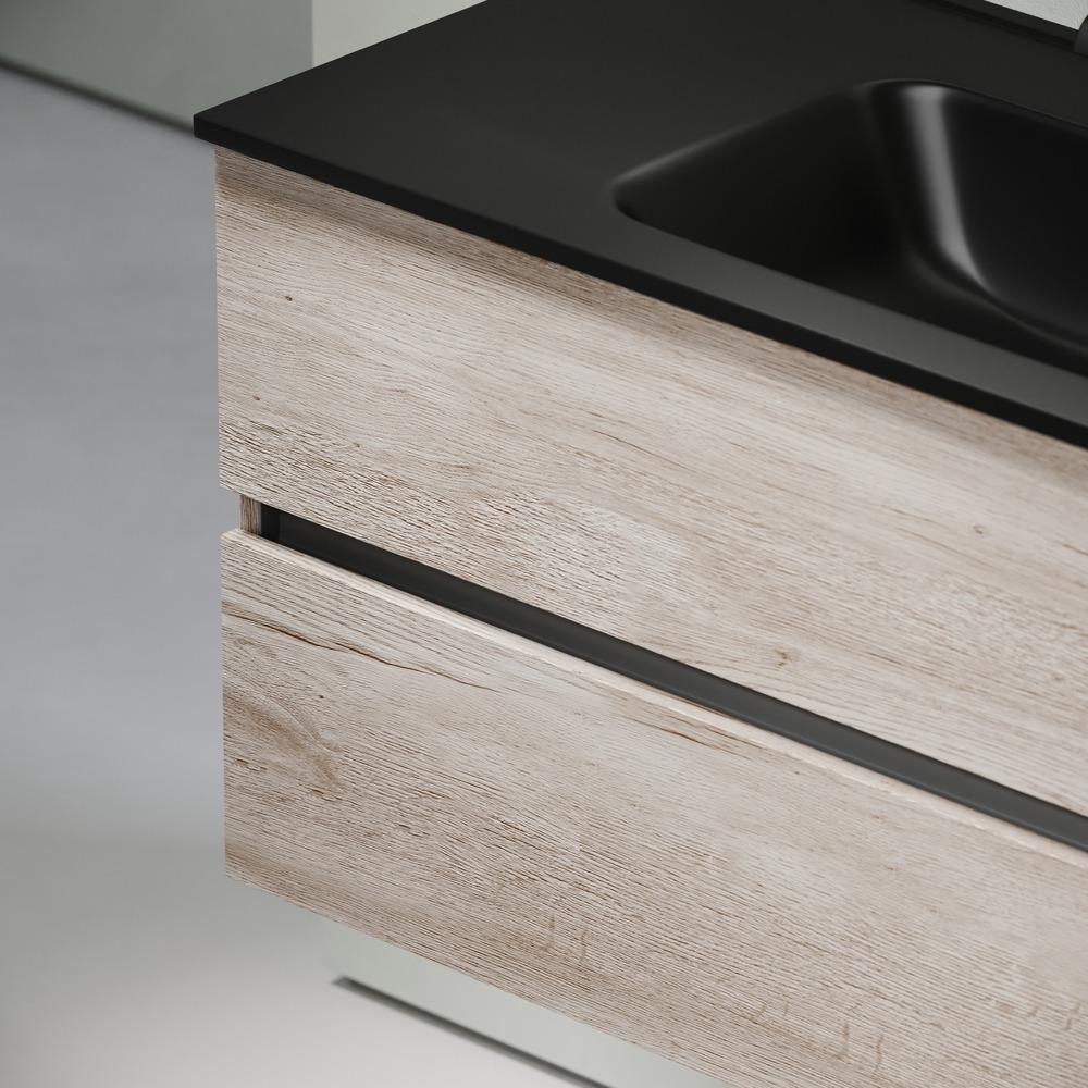 - Тумба подвесная Urban c двумя ящиками оснащенными доводчиками скрытого монтажа с системой плавного закрывания, а также с ручкой Gola по всей длине тумбы. Каркас тумбы и фасад выполнен из ЛДСП в цвете «дуб галифакс натуральный».