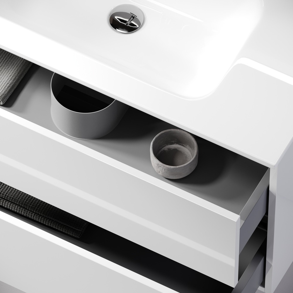• Тумба подвесная Urban c двумя ящиками оснащенными доводчиками скрытого монтажа с системой плавного закрывания, а также с ручкой Gola по всей длине тумбы. Корпус тумбы выполнен из ЛДСП, фасад – из МДФ с покрытием "эмаль" в цвете «белый глянец».