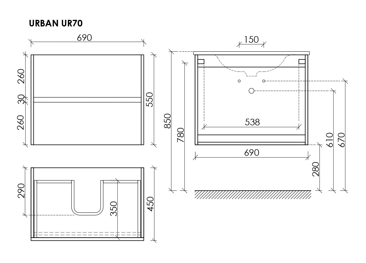 - Тумба подвесная Urban c двумя ящиками оснащенными доводчиками скрытого монтажа с системой плавного закрывания, а также с ручкой Gola по всей длине тумбы. Каркас тумбы и фасад выполнен из ЛДСП в цвете «дуб чарльстон».