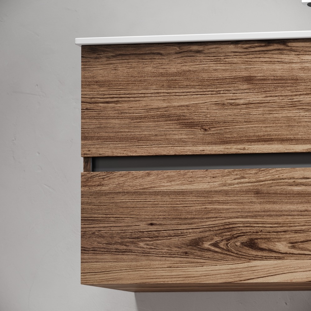 - Тумба подвесная Urban c двумя ящиками оснащенными доводчиками скрытого монтажа с системой плавного закрывания, а также с ручкой Gola по всей длине тумбы. Каркас тумбы и фасад выполнен из ЛДСП в цвете «дуб чарльстон».