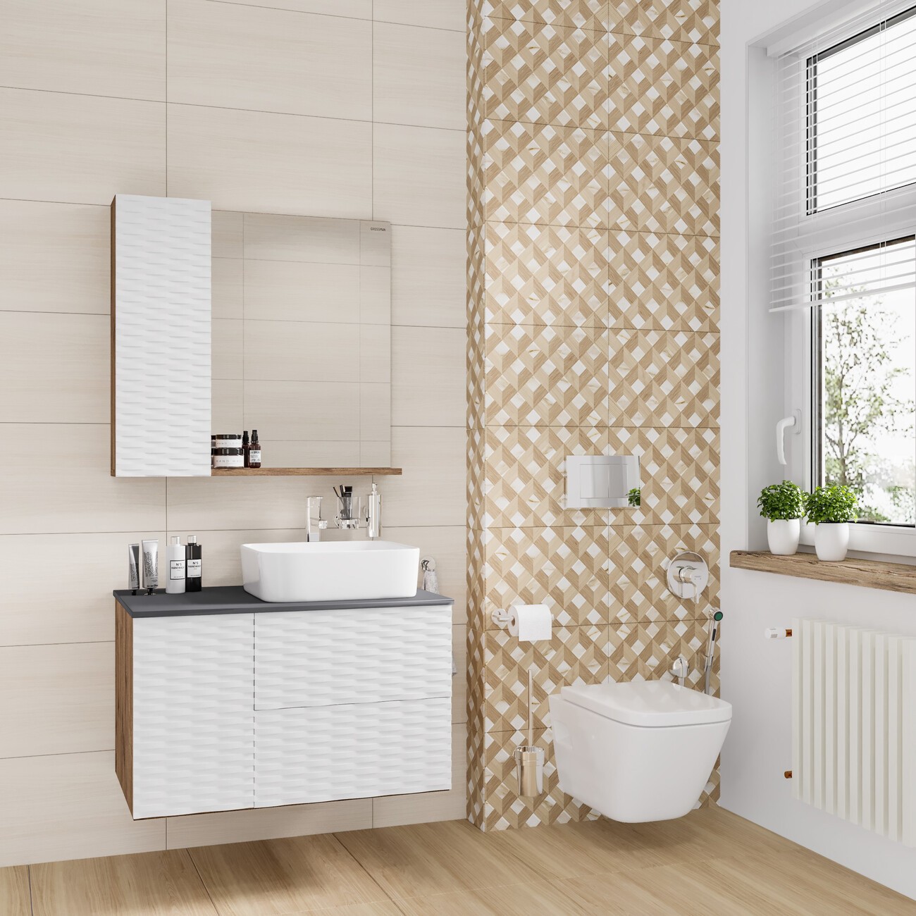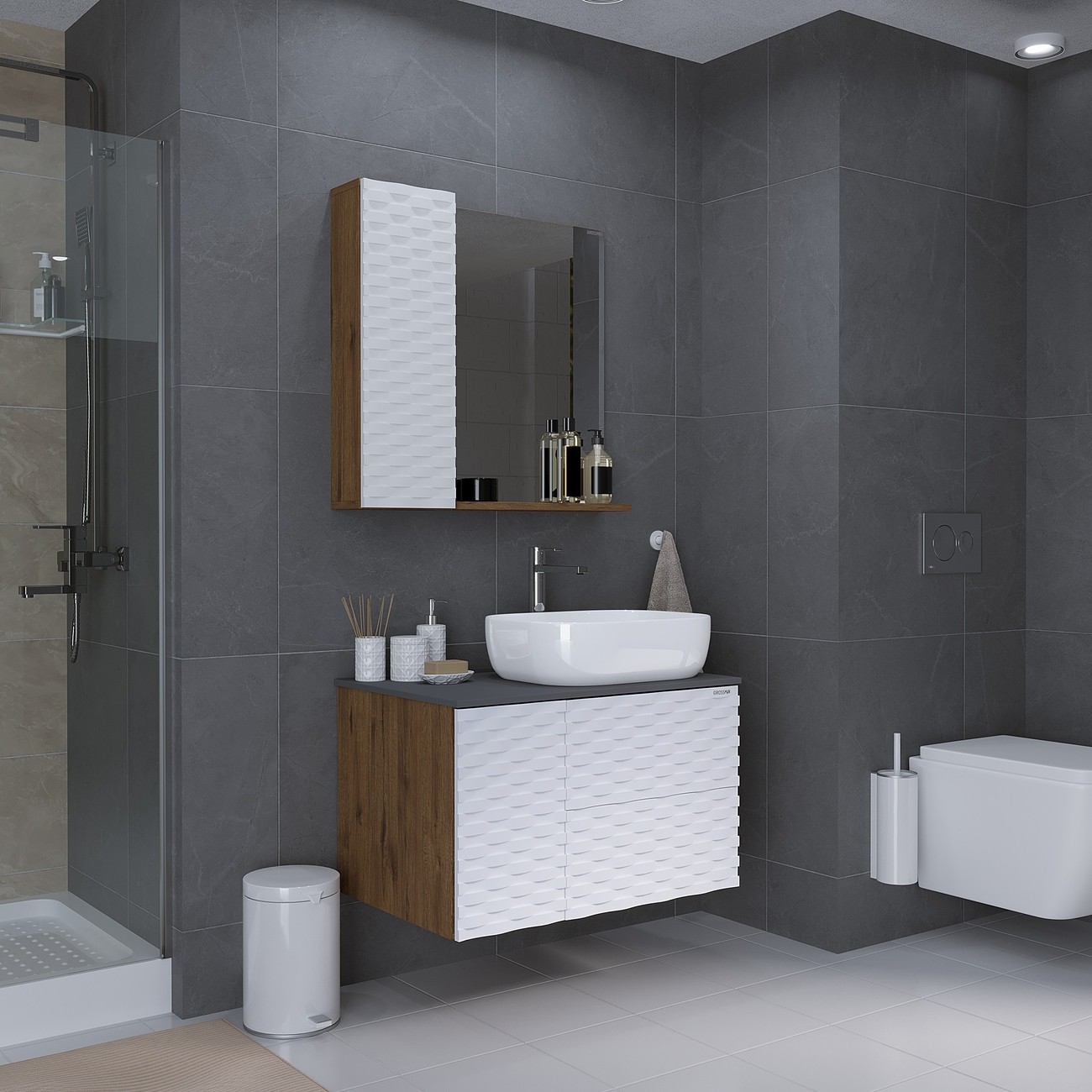 Тумба подвесная со столешницей Grossman Альба 80 см с раковиной Grossman Classic GR-3016 48 см, цвет веллингтон/белая.