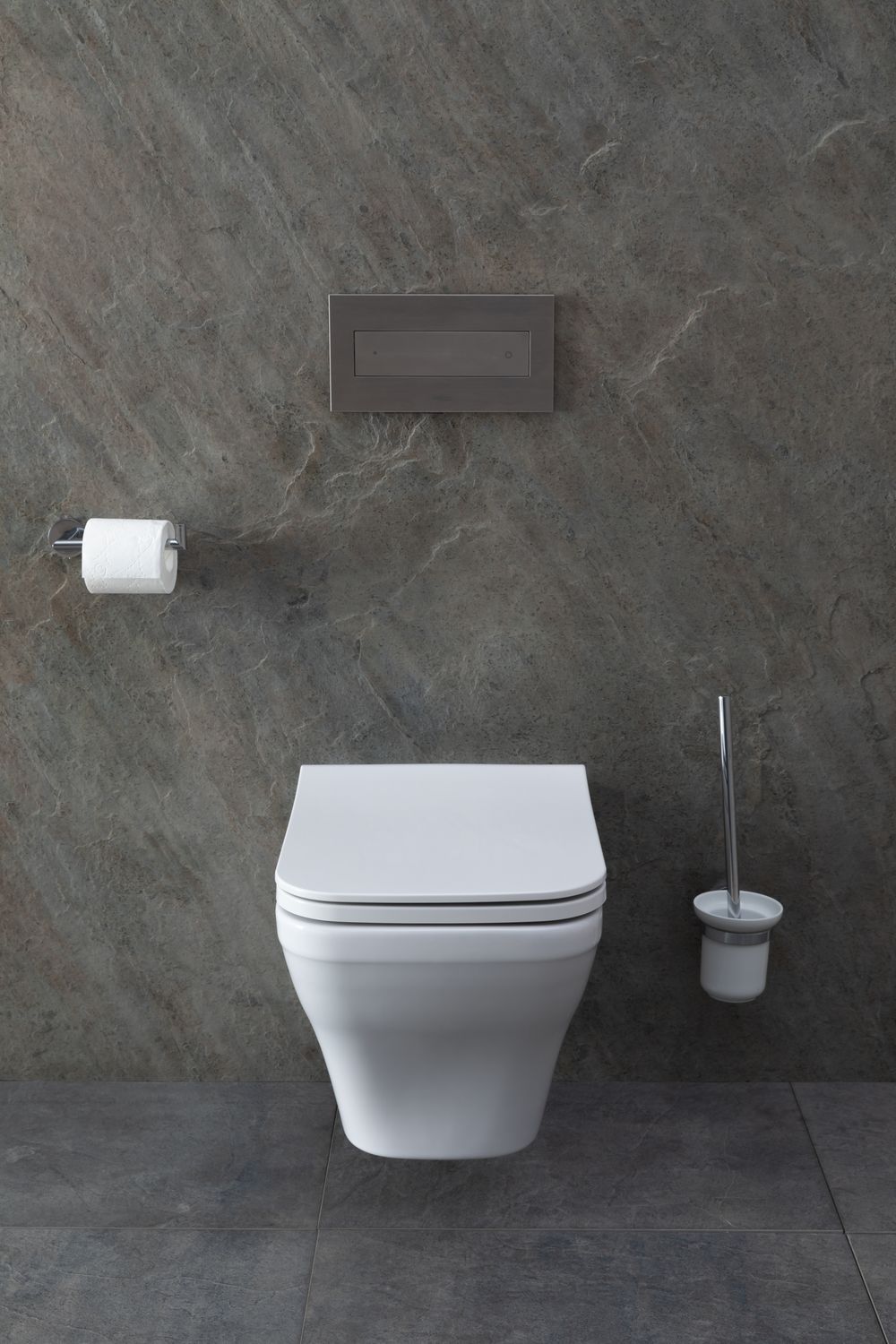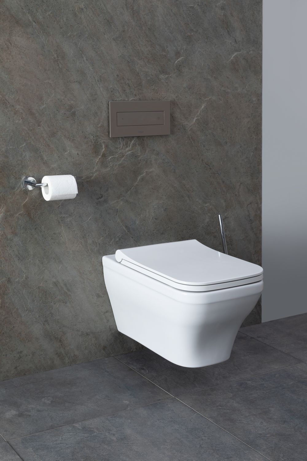 - Механизм сливного бочка монтируется в стену, выполнен в лаконичной прямоугольной форме с кнопкой слива.
