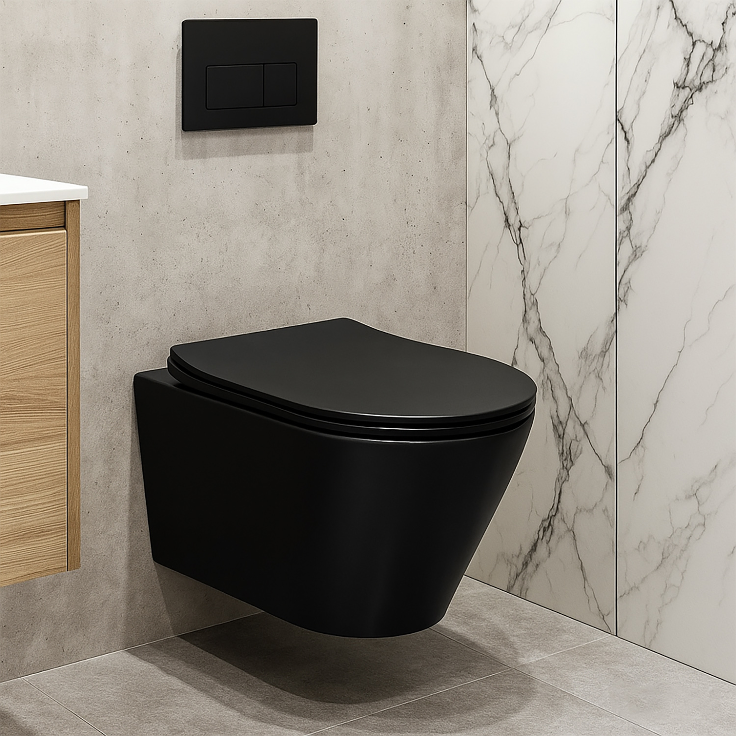 - Стильный дизайн: Черный матовый цвет и лаконичные формы придают унитазу современный и элегантный вид.
