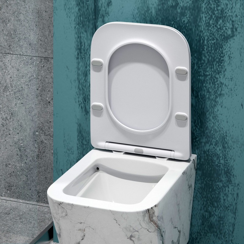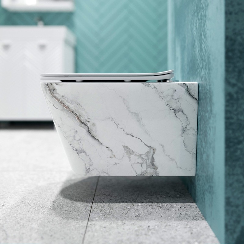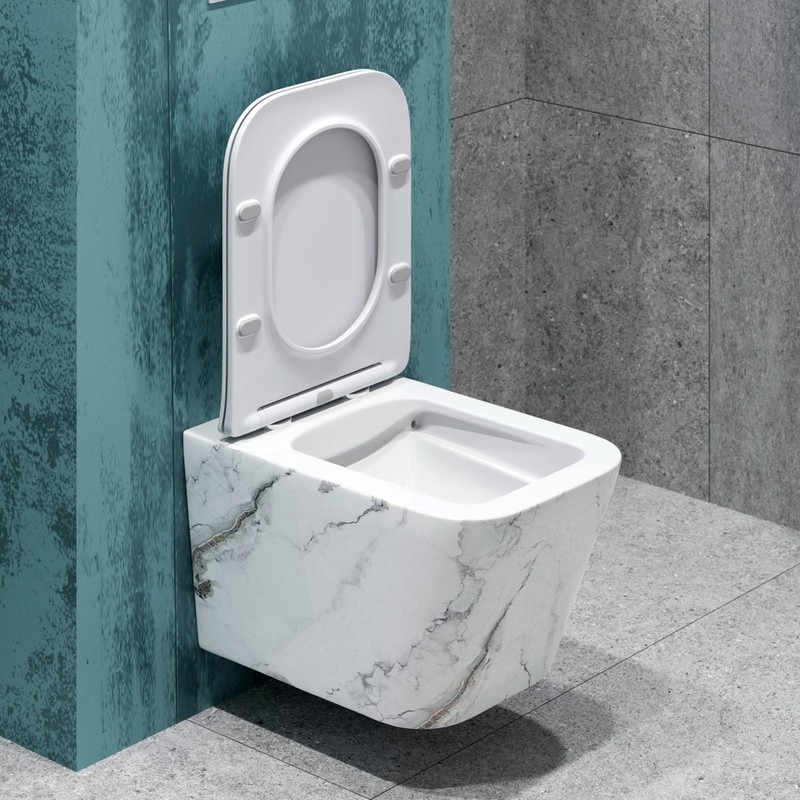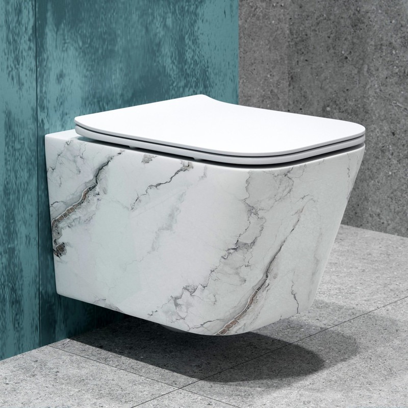 Унитаз подвесной безободковый EvaGold EG070018, каскадный слив, сиденье с тонкой крышкой микролифт, цвет белый мрамор.