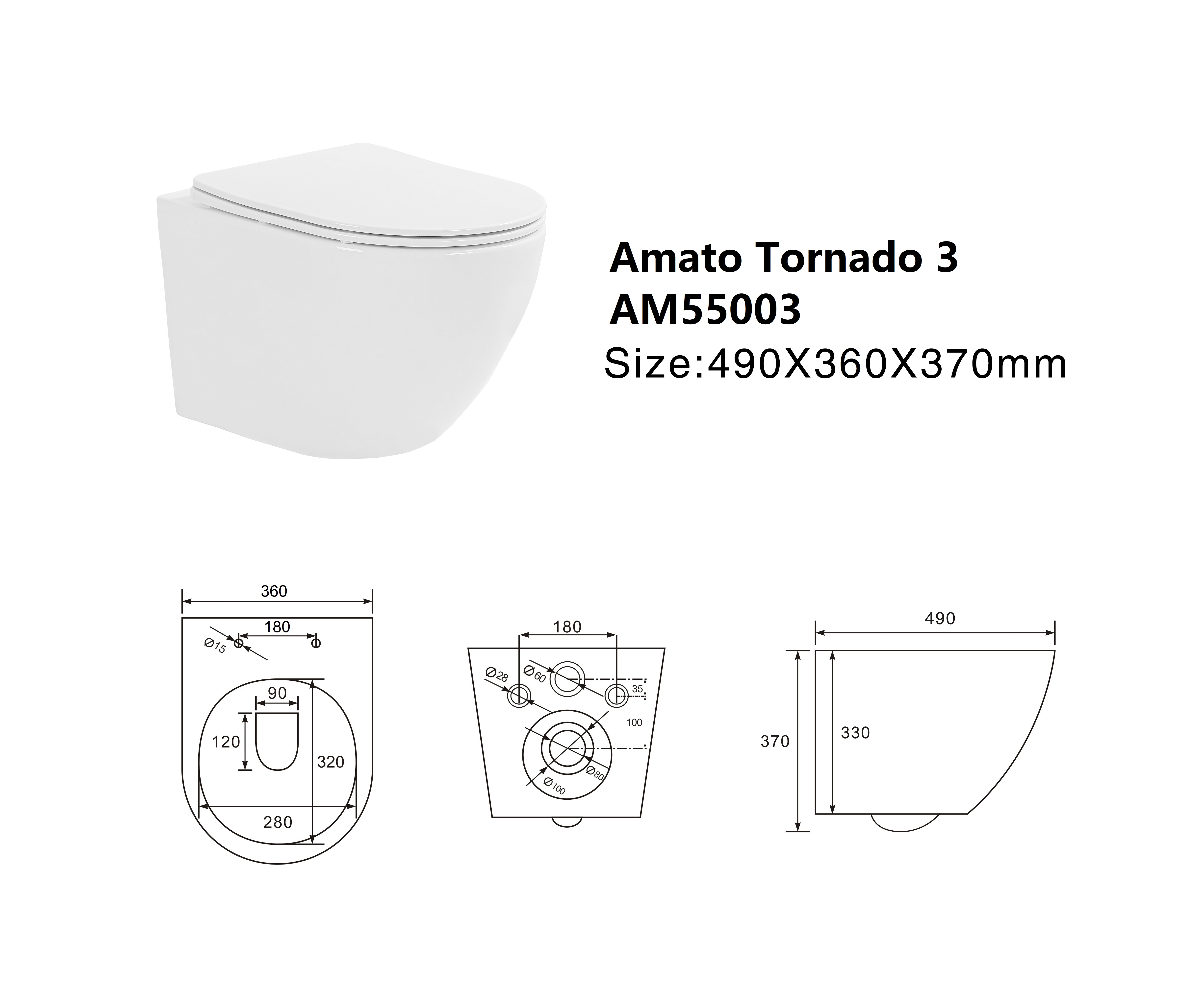 Унитаз подвесной безободковый Taliente Amato Tornado 3 AM55003, в комплекте сиденье с крышкой микролифт, цвет белый.