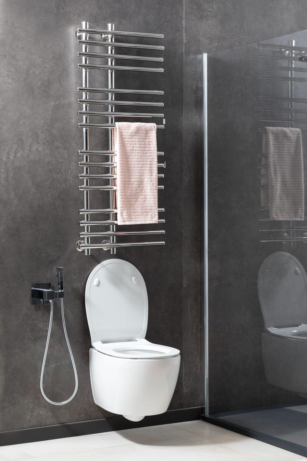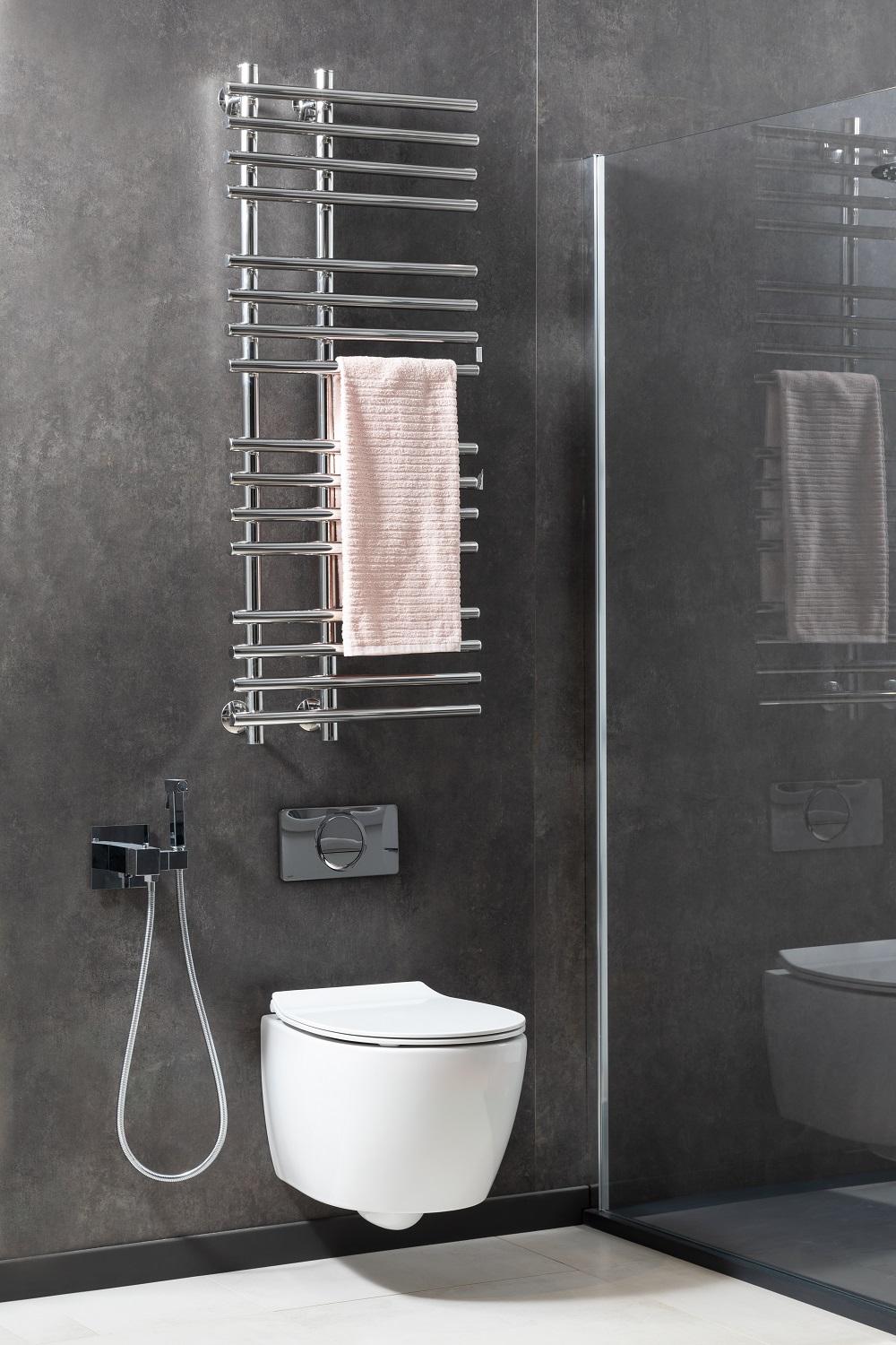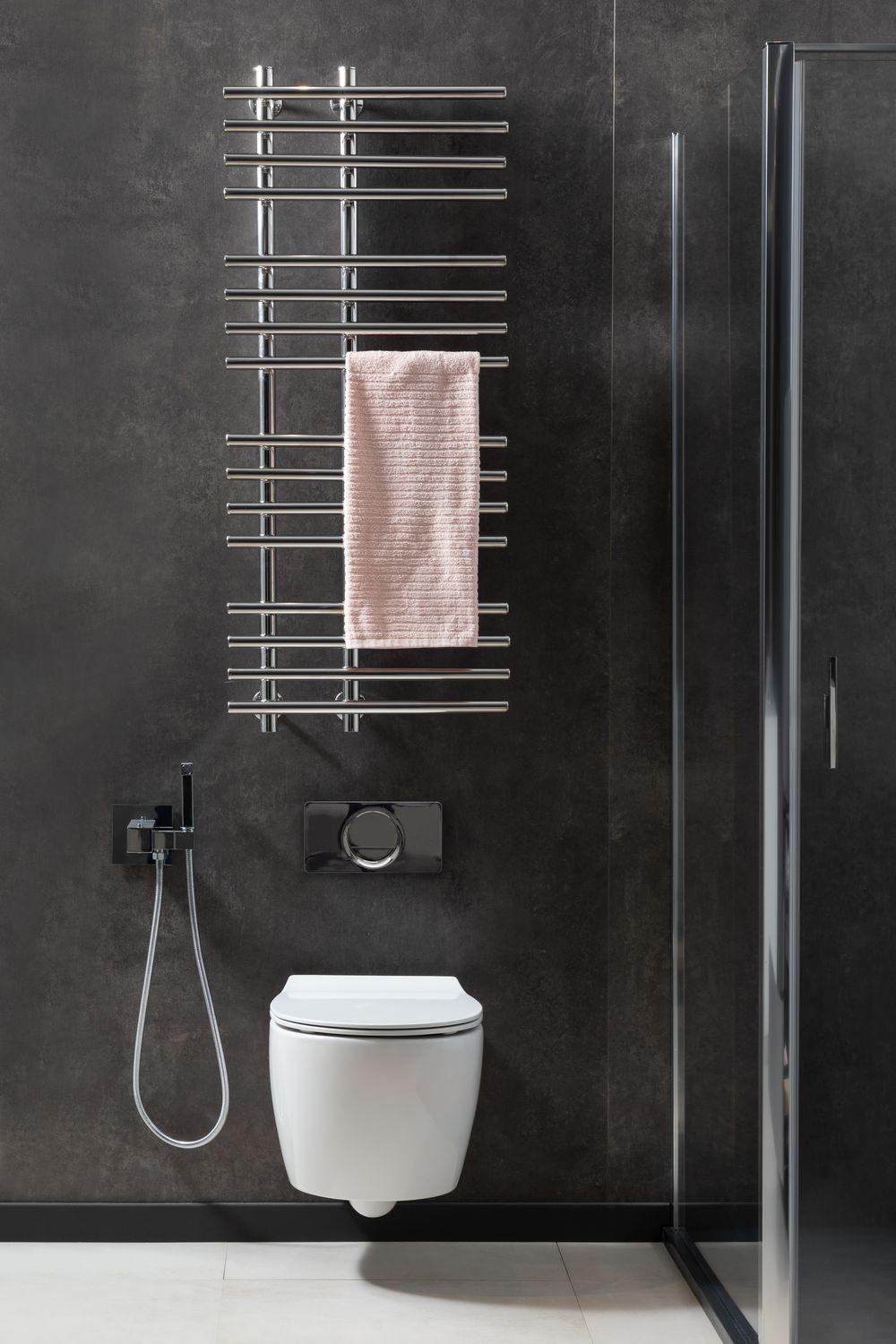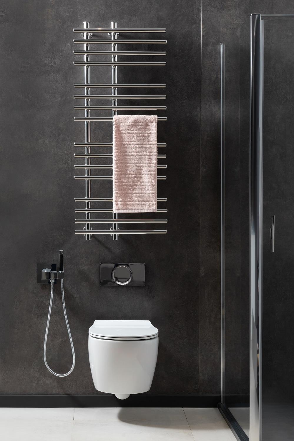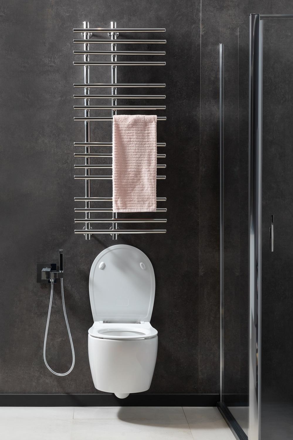 - Белый глянец является универсальным вариантом для любых туалетных и ванных комнат. Например, данная модель будет органично смотреться в сканди-интерьере или лофте.