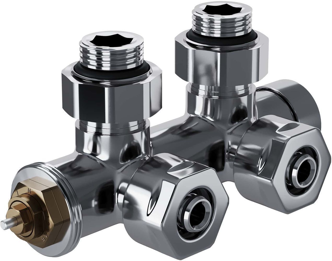 - Узел нижнего подключения термостатический угловой серии Design Pro поставляется в необходимой для чистового монтажа комплектации: клапан термостатический для установки на подающий трубопровод, запорный клапан для установки на обратный трубопровод, 2 гайки-фитинга для подключения клапанов к монтажной трубке 15 мм и 2 цельных латунных отражателя с внутренним резиновым уплотнением внутренним диаметром 15,2 мм.