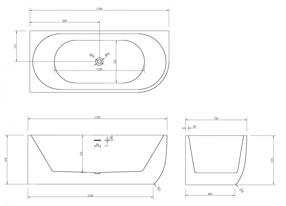 Ванна акриловая Abber AB9315 L 170x75 см, в комплекте слив-перелив и каркас, цвет белый.