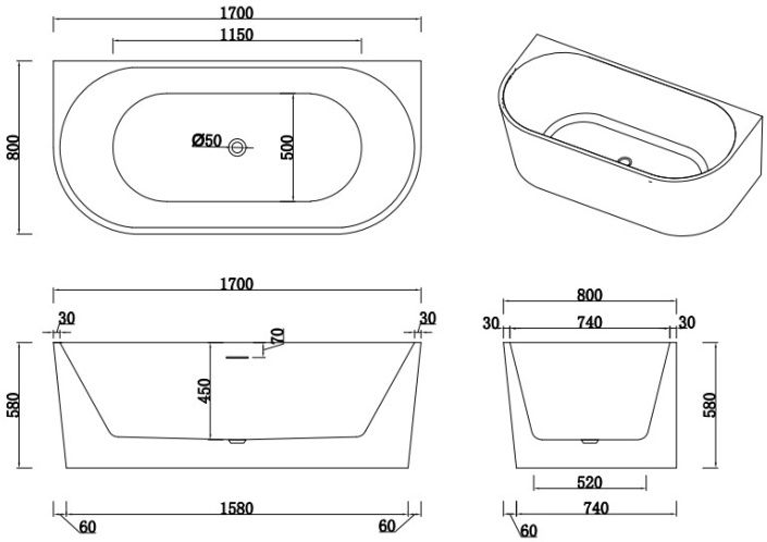 Ванна акриловая AN Dea, размер 1700x800x580 мм, цвет белый.
