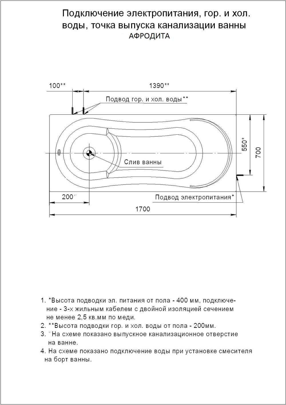 Ванна акриловая Aquatek Афродита, размер 1700x700 мм, цвет белый. Каркас, панель и сифон приобретается отдельно.